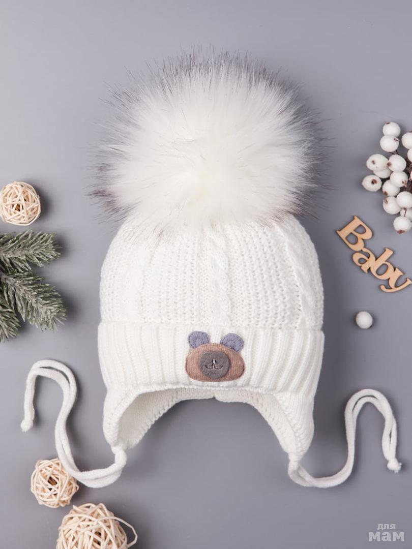 5) Шапка трикотажная для девочки с ушками + снуд, куколки, на отвороте нашивка RusBubon, белый, р.53-56- 199 руб.