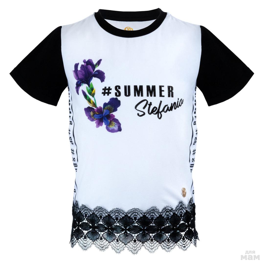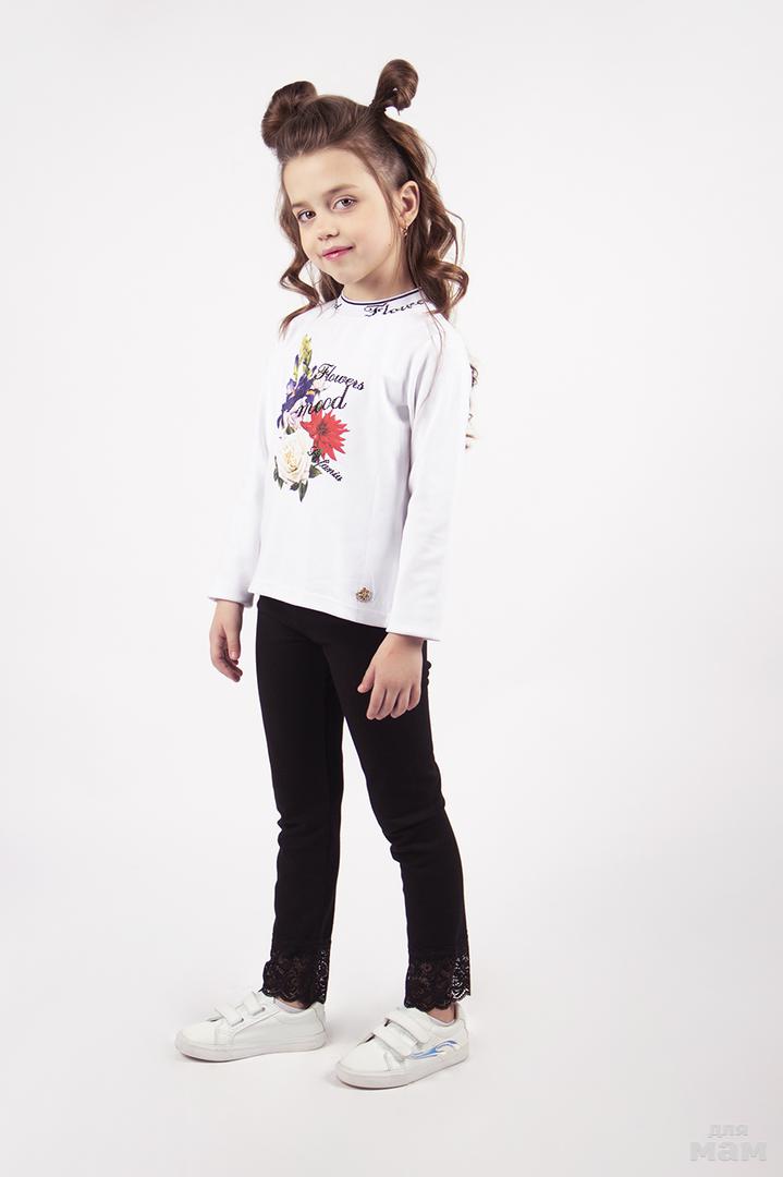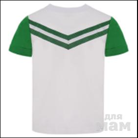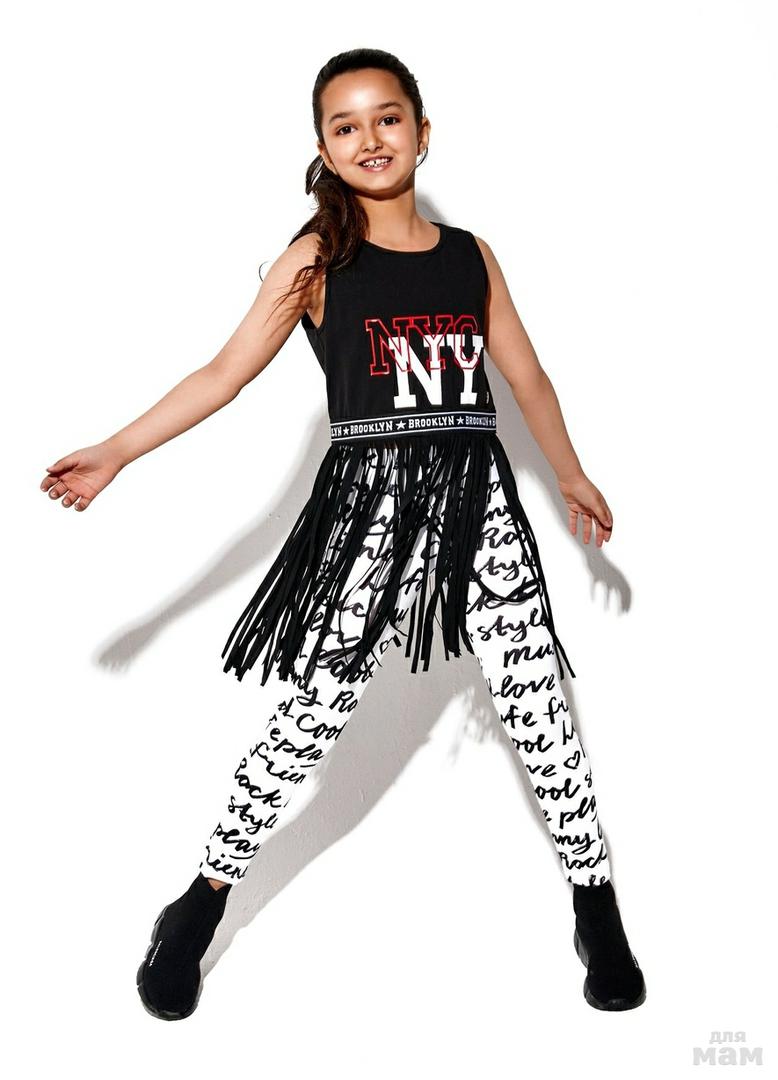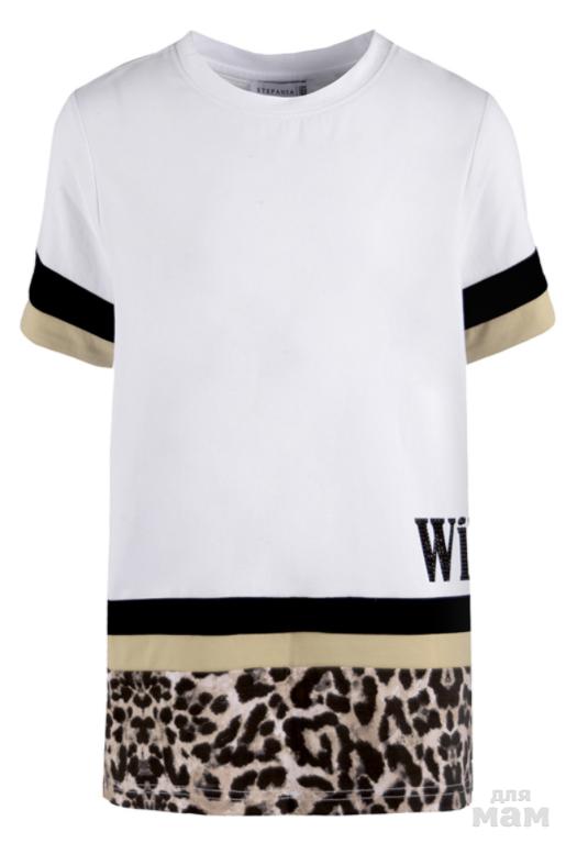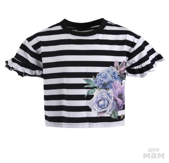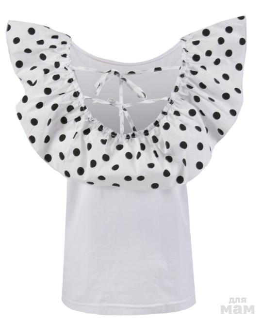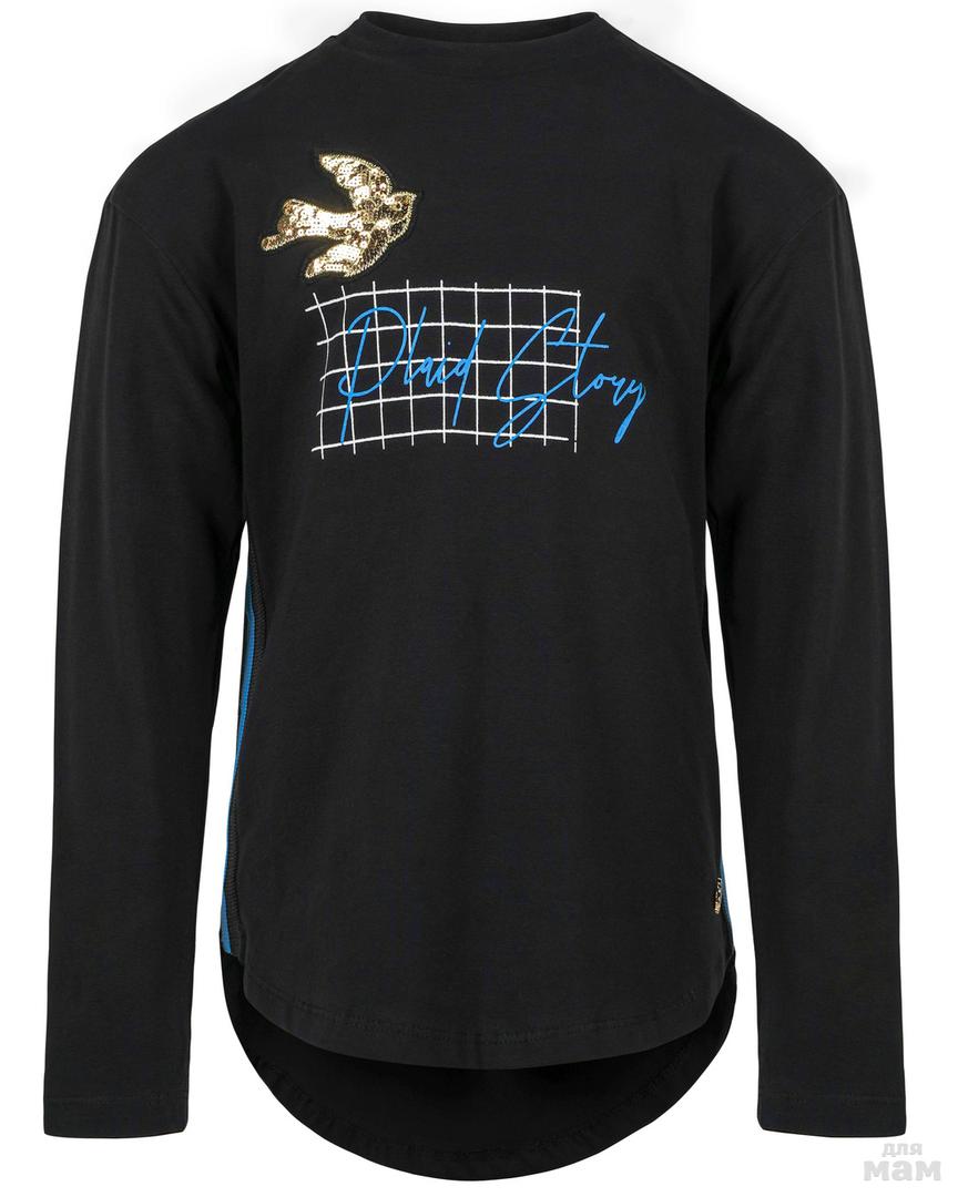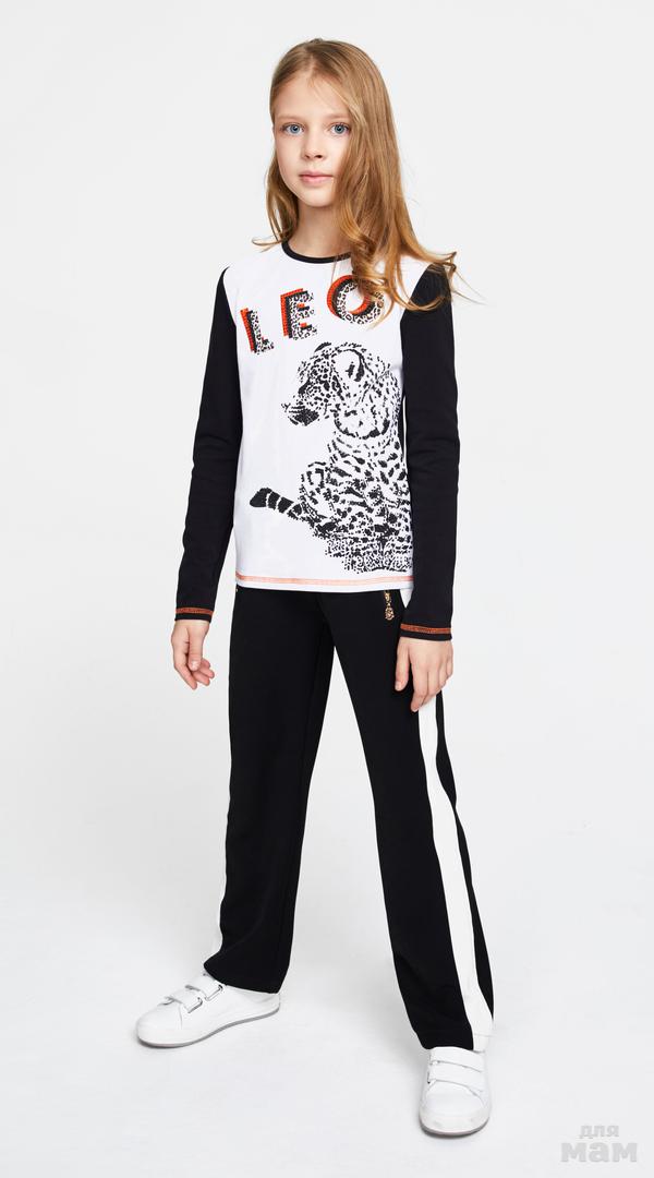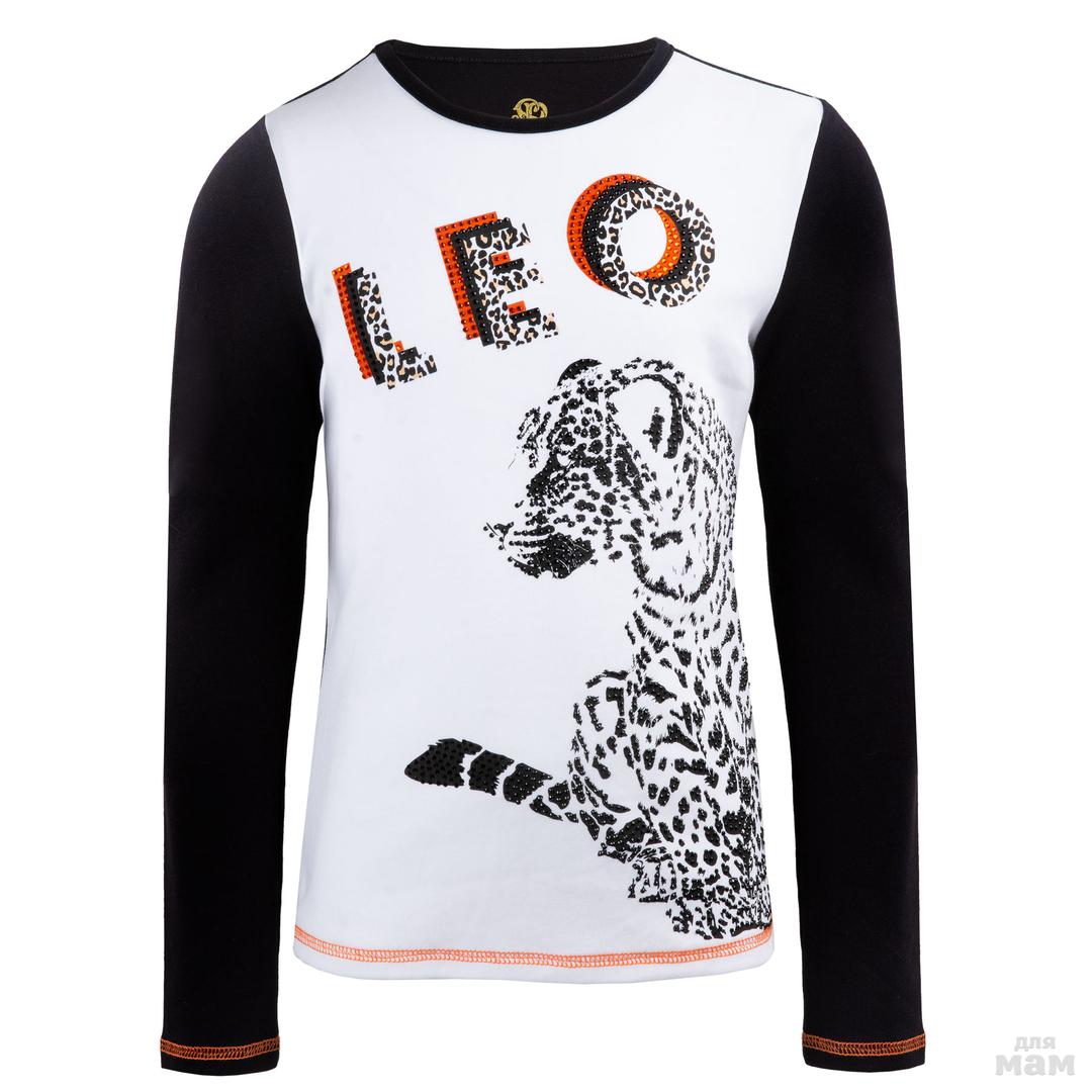 Двухцветная чёрно-белая футболка с круглым вырезом из плотного трикотажа с длинным рукавом и принтом, выполненным стразами среднего размера в цвет фона. Горловина из ткани того же качества черного цвета. Отстрочка нижнего края изделия и рукавов выполнена оранжевой нитью.