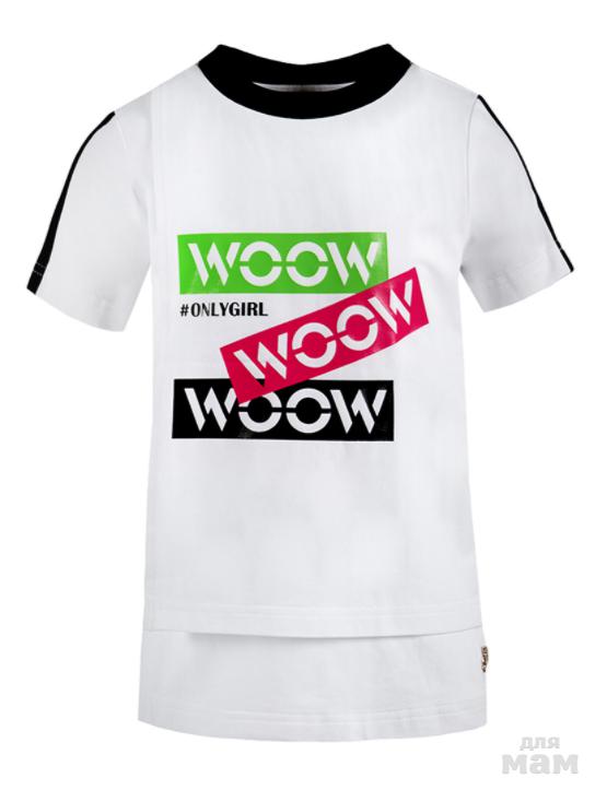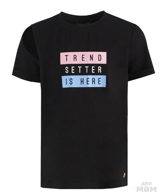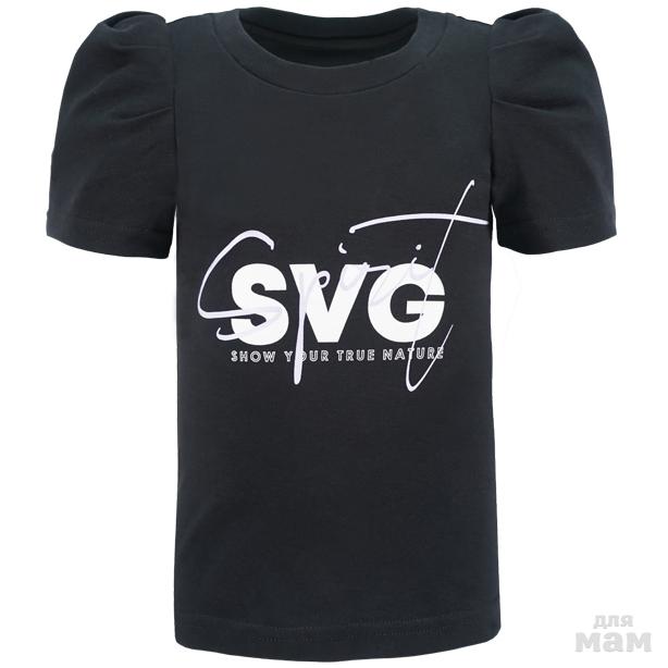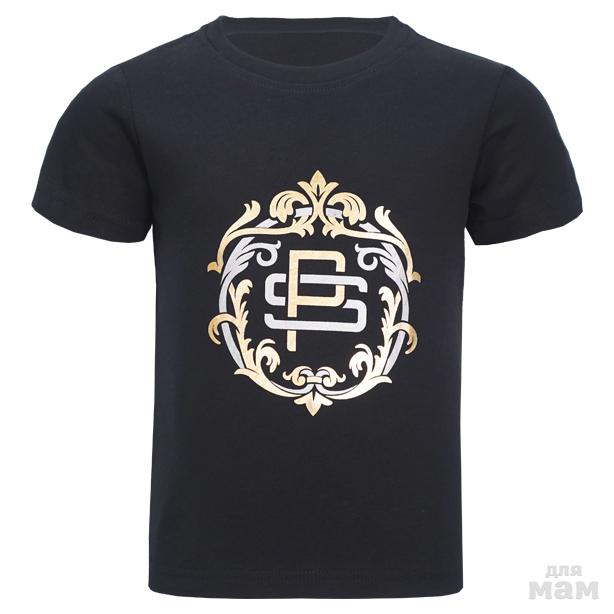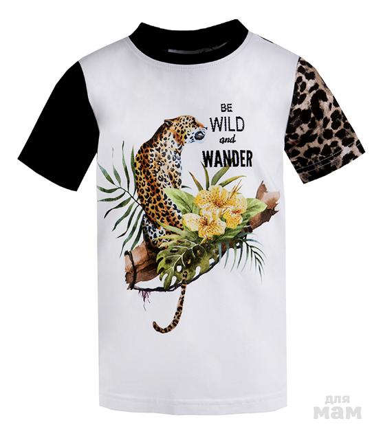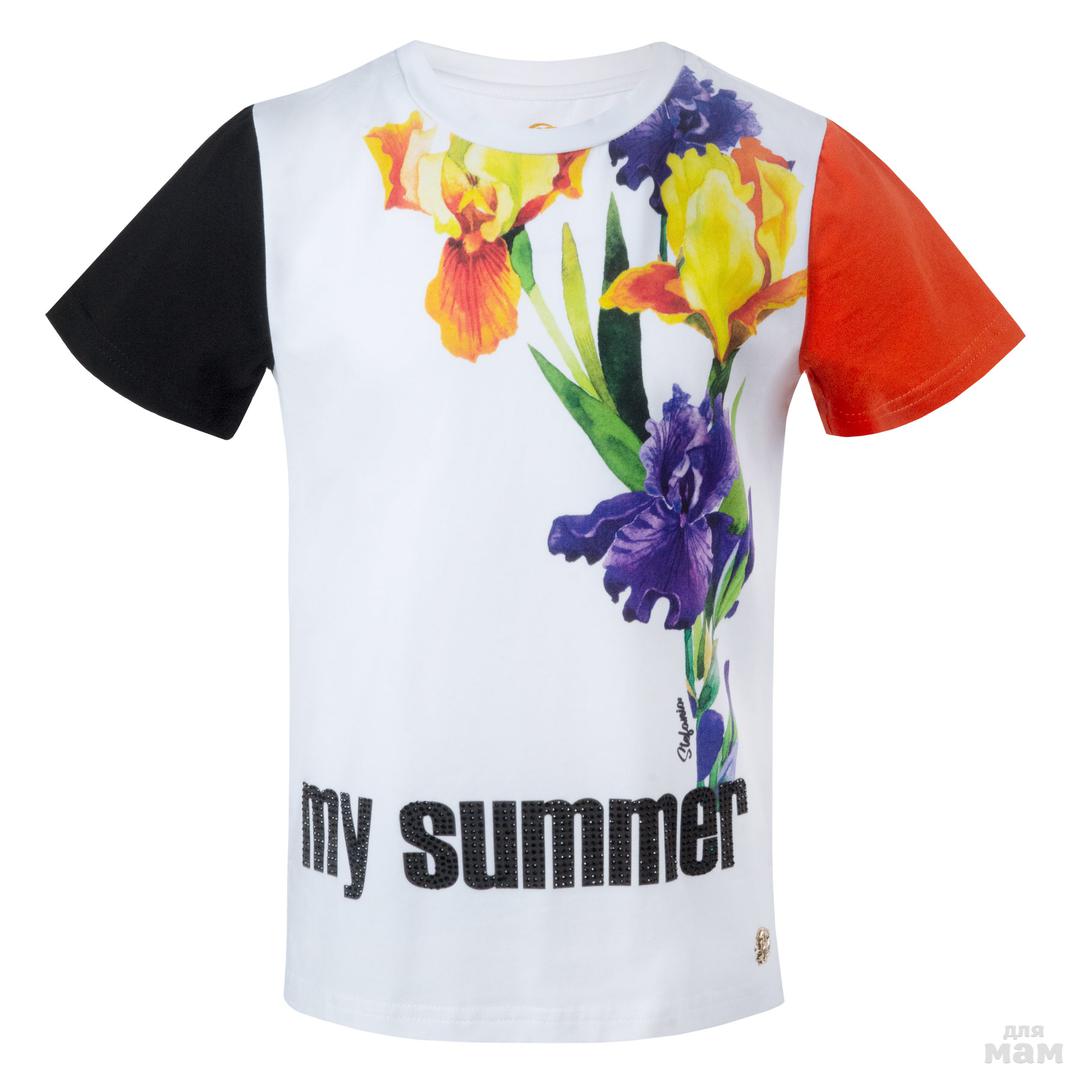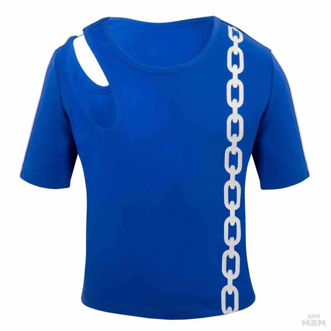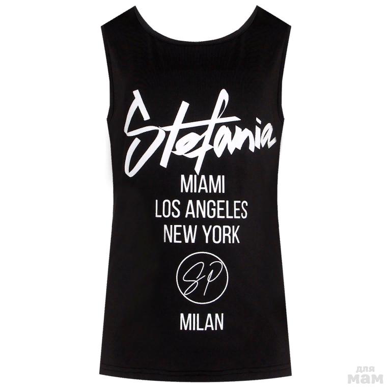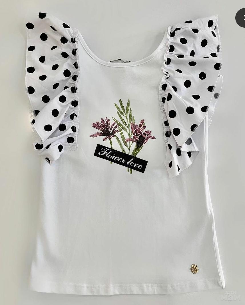 Двухцветная чёрно-белая футболка с круглым вырезом из плотного трикотажа с длинным рукавом и принтом, выполненным стразами среднего размера в цвет фона. Горловина из ткани того же качества черного цвета. Отстрочка нижнего края изделия и рукавов выполнена оранжевой нитью.