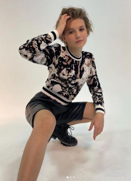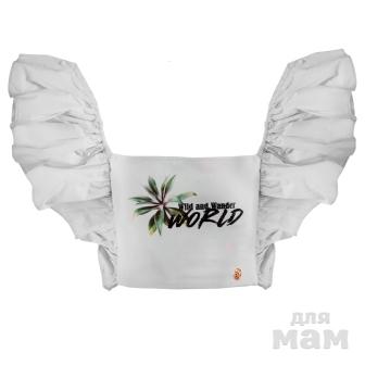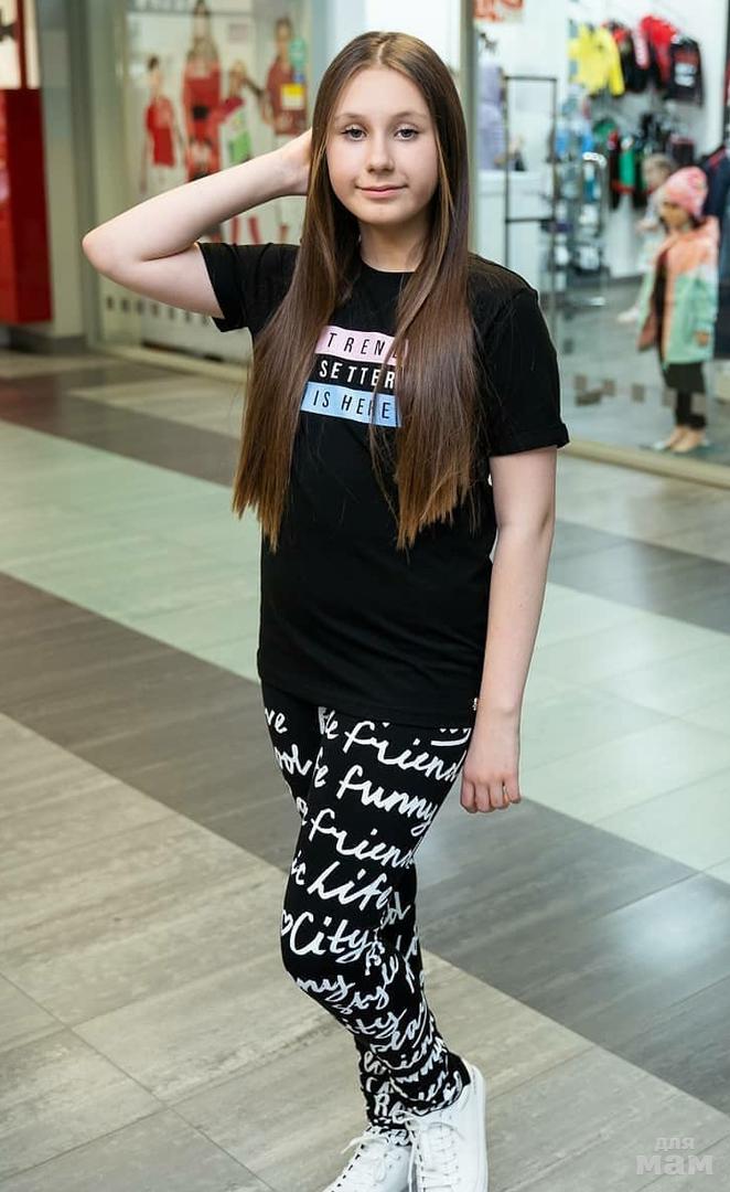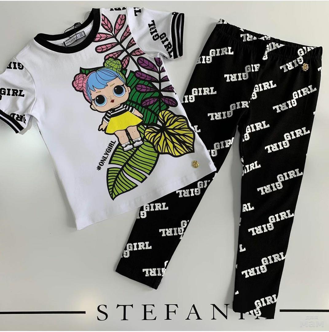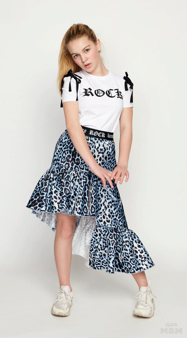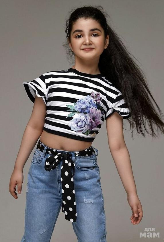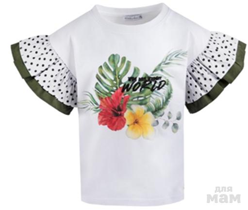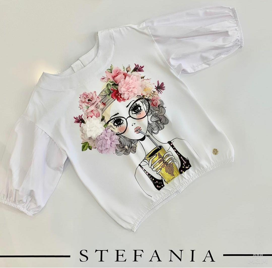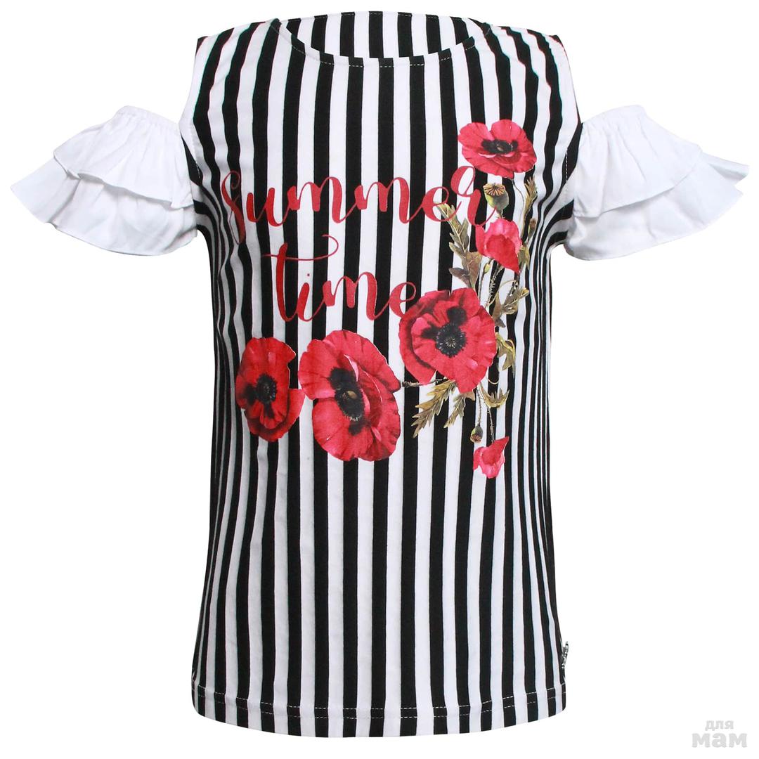 Двухцветная чёрно-белая футболка с круглым вырезом из плотного трикотажа с длинным рукавом и принтом, выполненным стразами среднего размера в цвет фона. Горловина из ткани того же качества черного цвета. Отстрочка нижнего края изделия и рукавов выполнена оранжевой нитью.