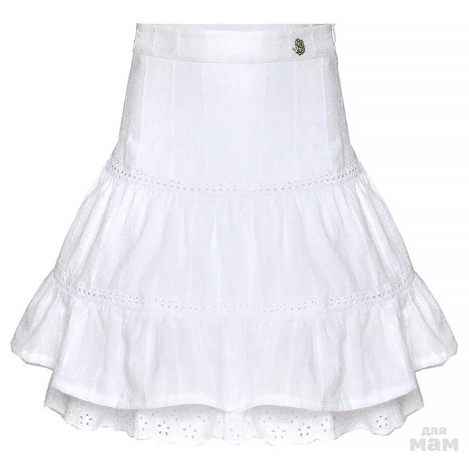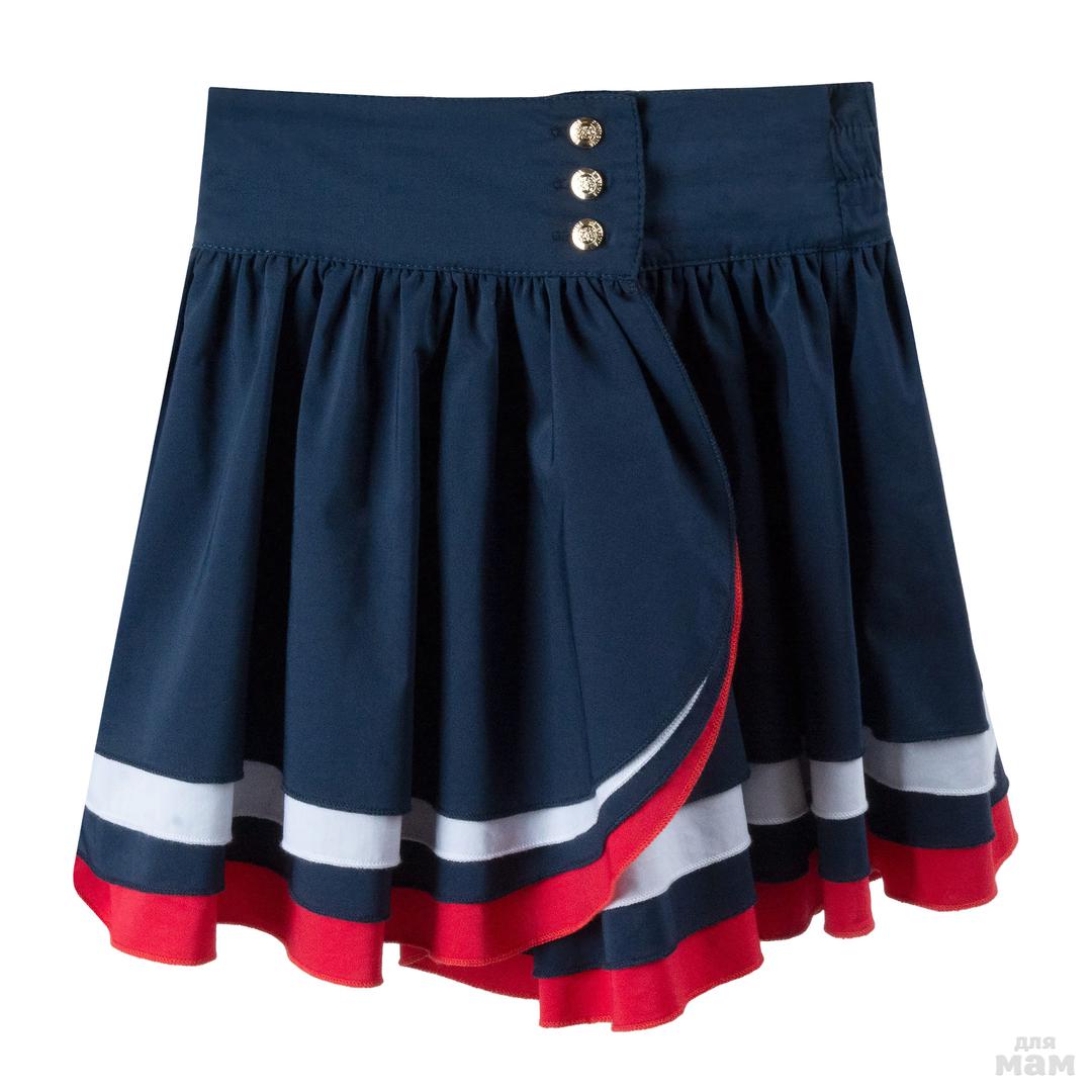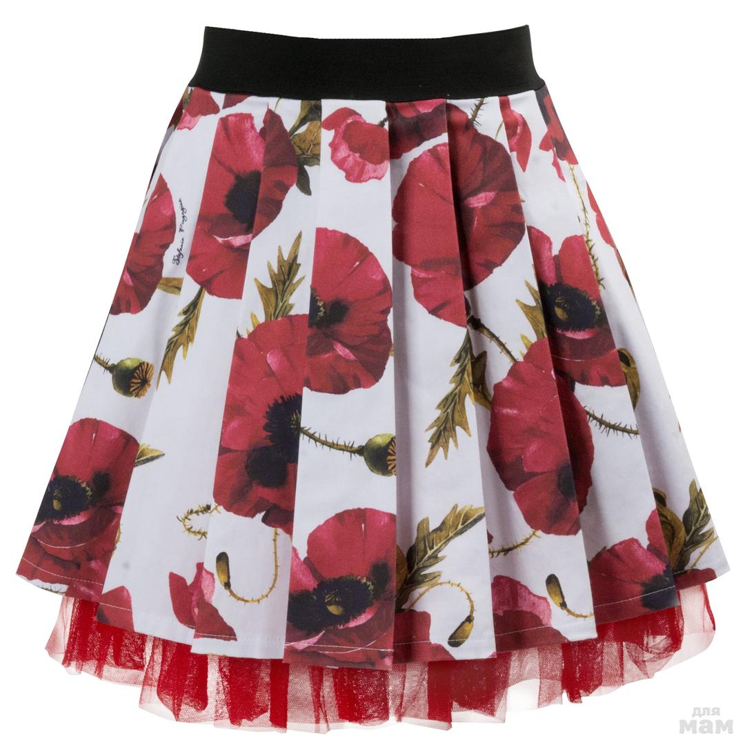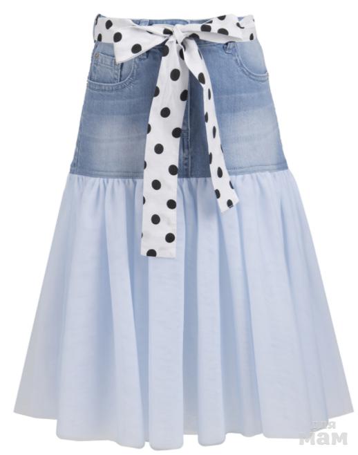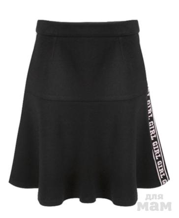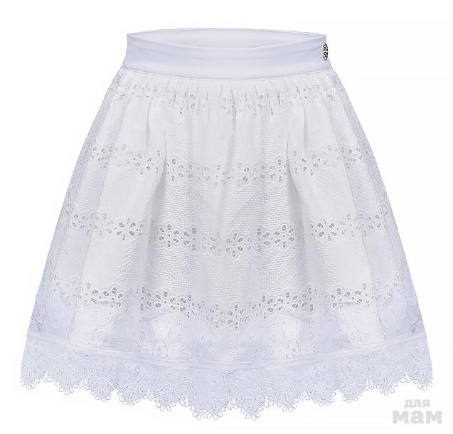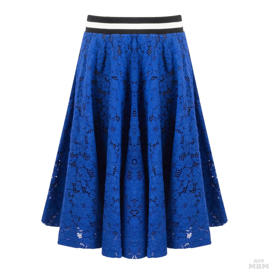 Юбка-солнце на резинке в полоску, из кордового гипюра на контрастной подкладке, с лампасами из контрастной тесьмы с надписями.