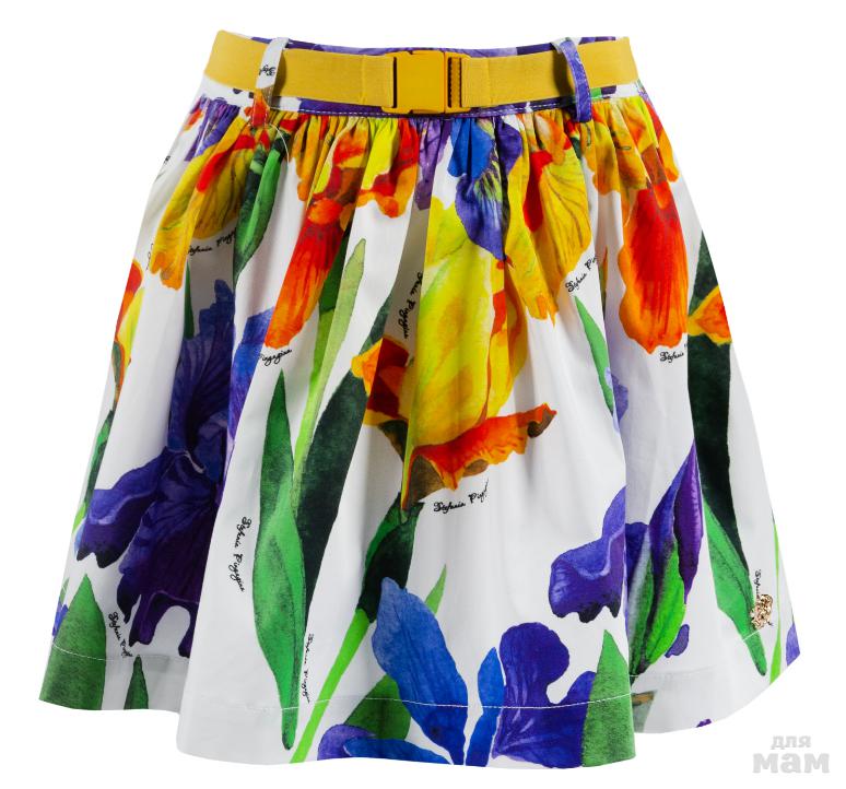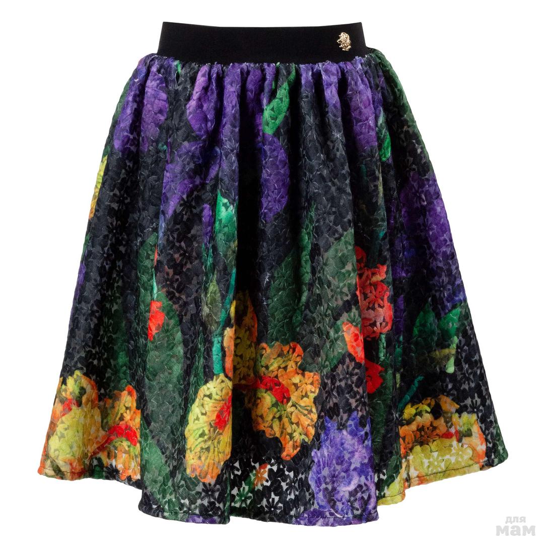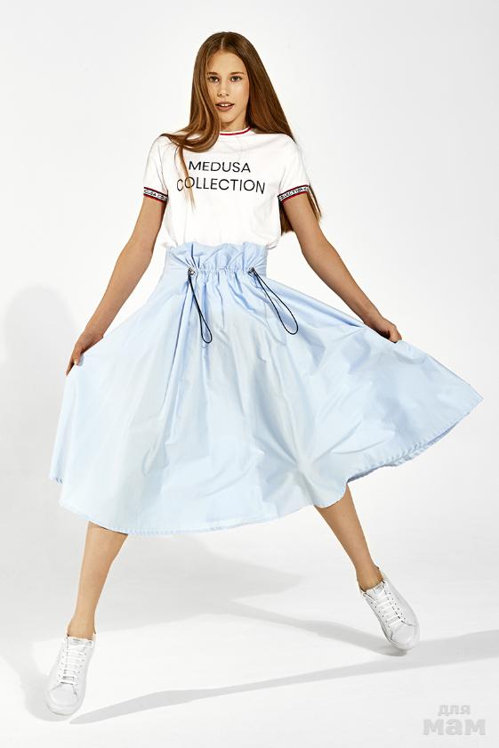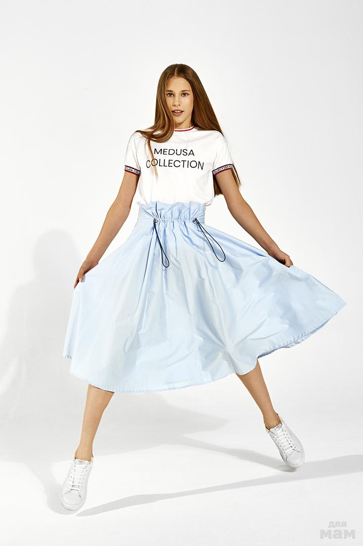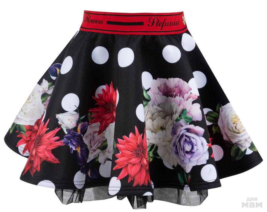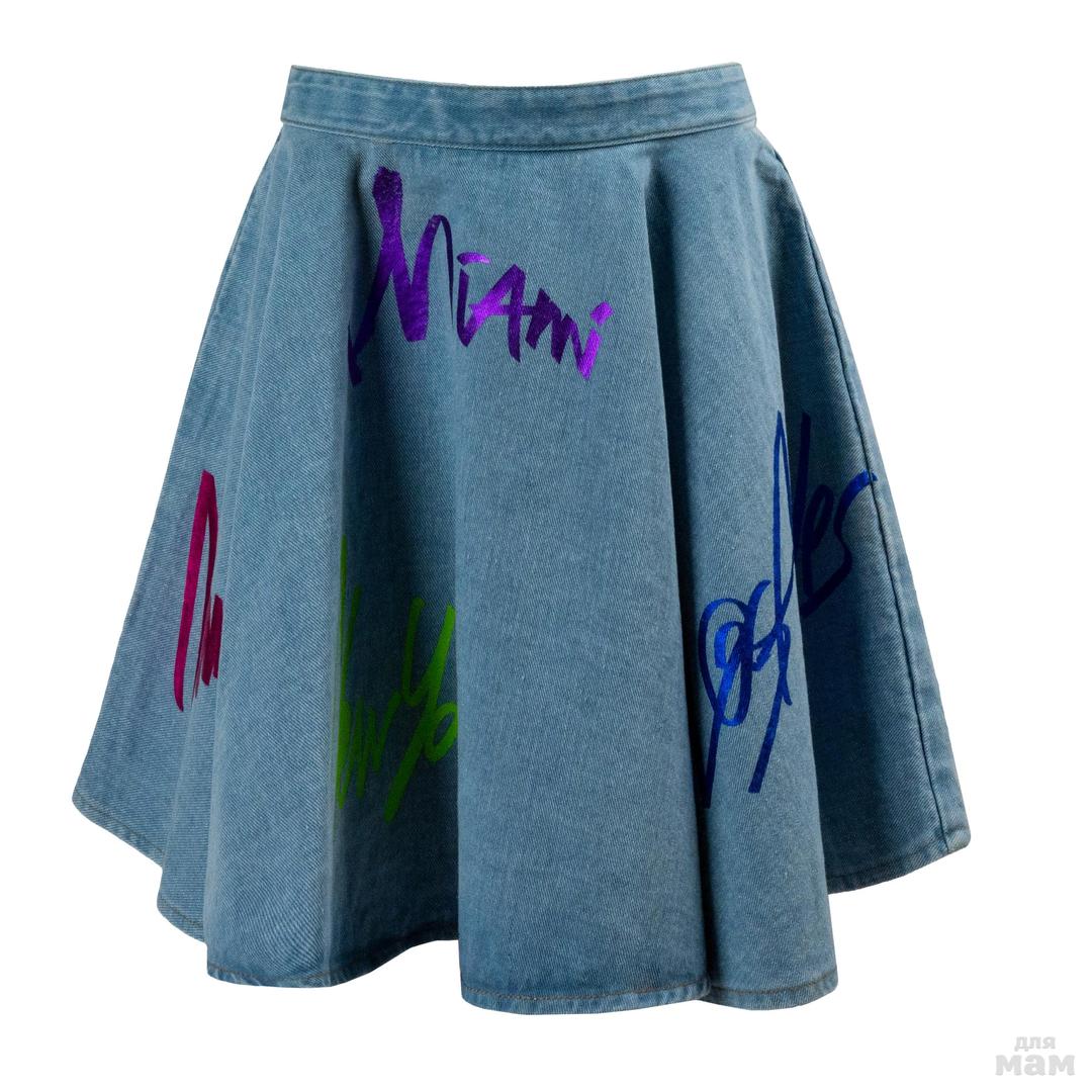 Юбка-солнце на резинке в полоску, из кордового гипюра на контрастной подкладке, с лампасами из контрастной тесьмы с надписями.