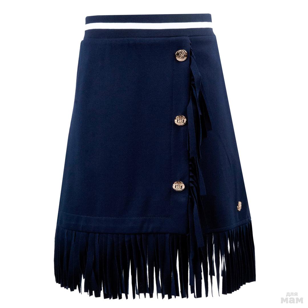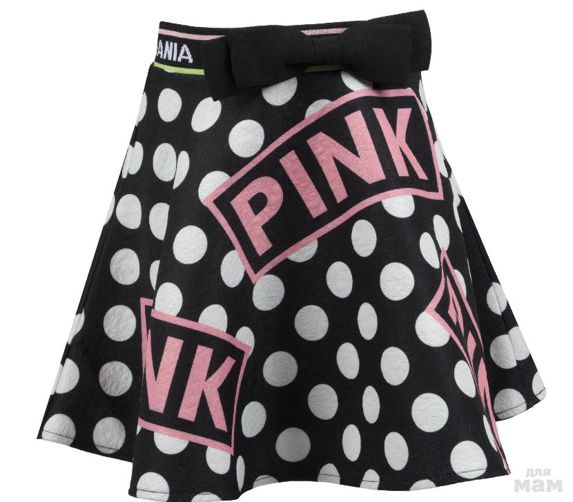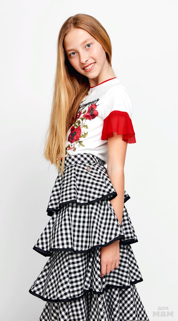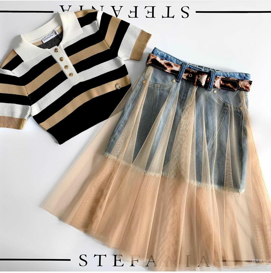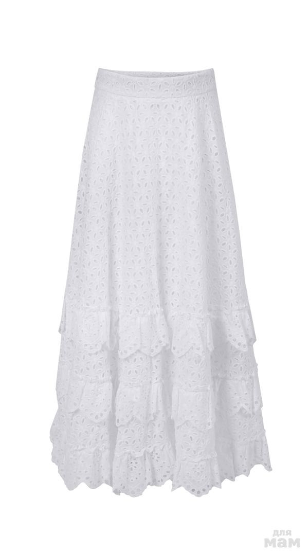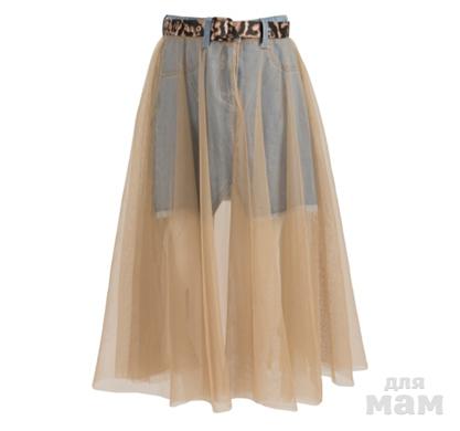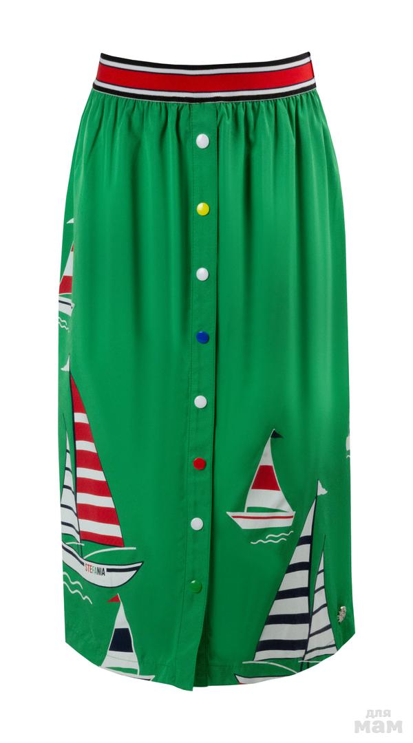 Юбка-солнце на резинке в полоску, из кордового гипюра на контрастной подкладке, с лампасами из контрастной тесьмы с надписями.