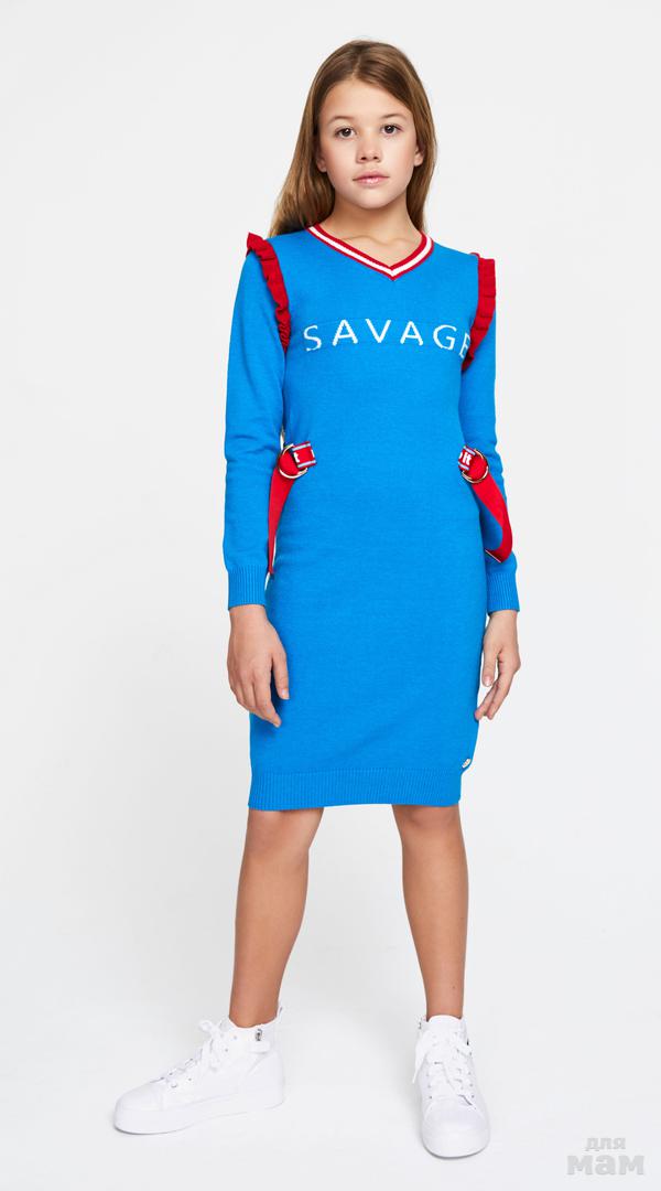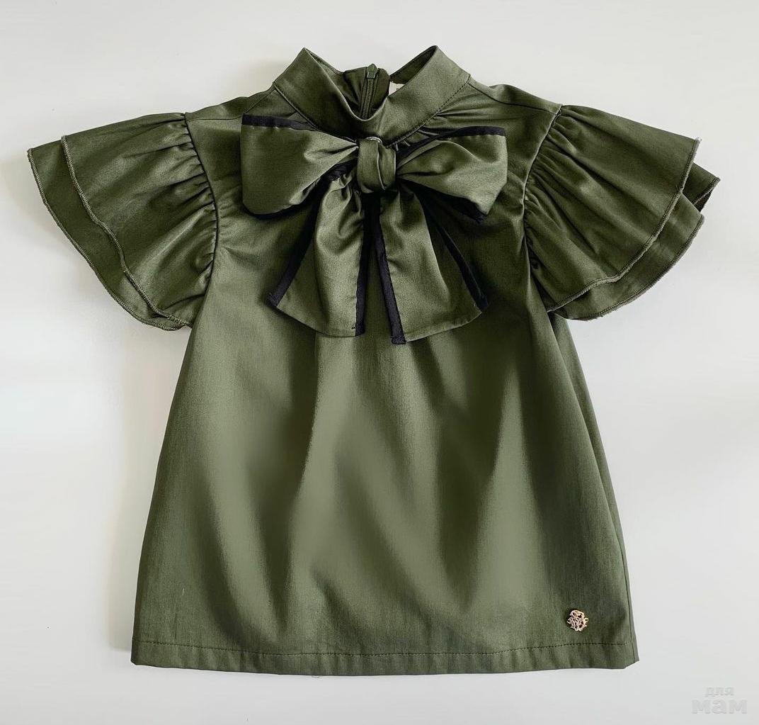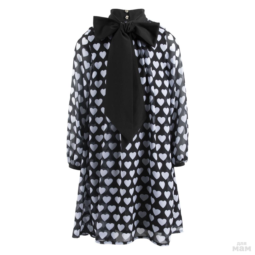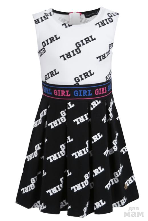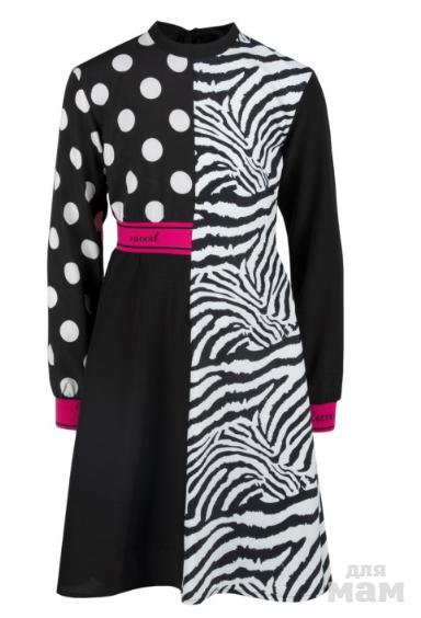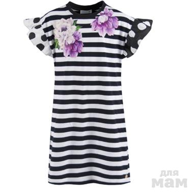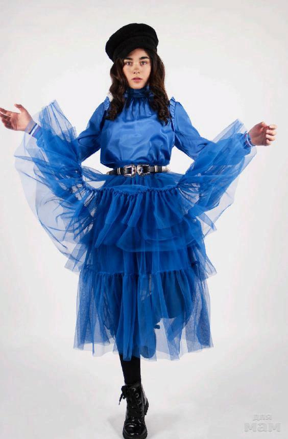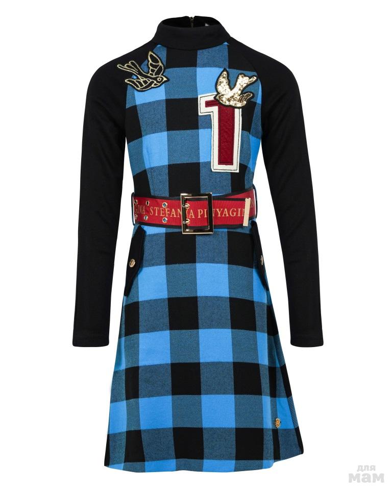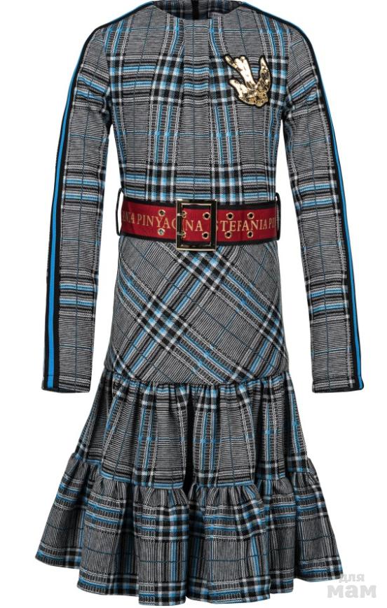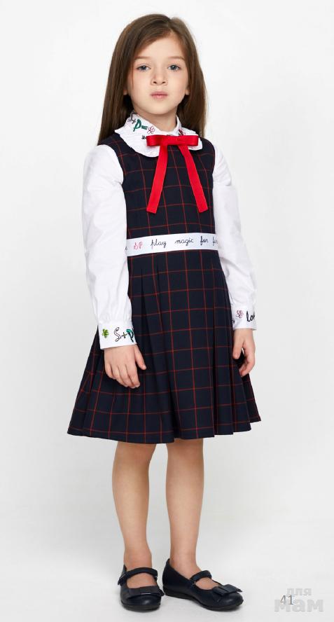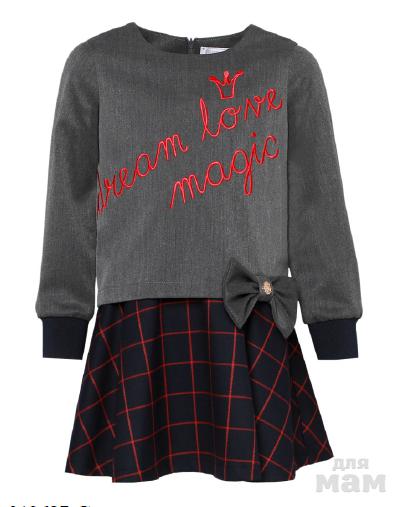 Комбинированное платье из костюмной ткани с круглым вырезом и длинным ирукавом. На лицевой стороне изделия вышита надпись, также платье декорировано бантом из ткани того жэе качества. Сзади застегивается на потайную молнию. Манжеты выполнены из резинки синего цвета