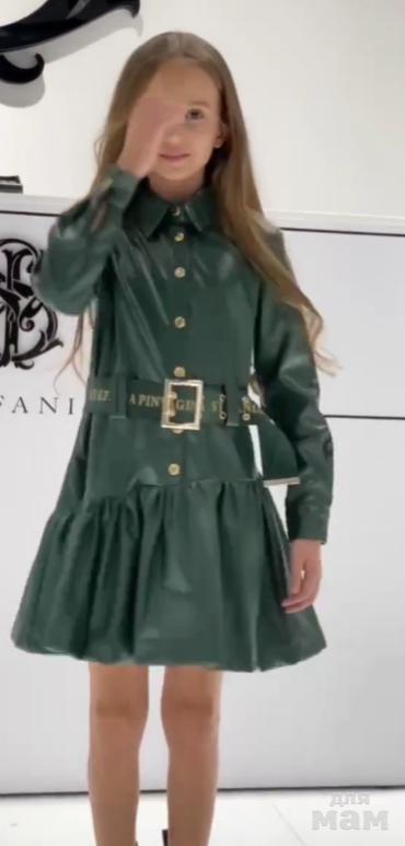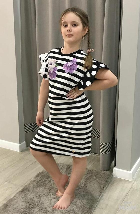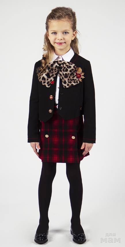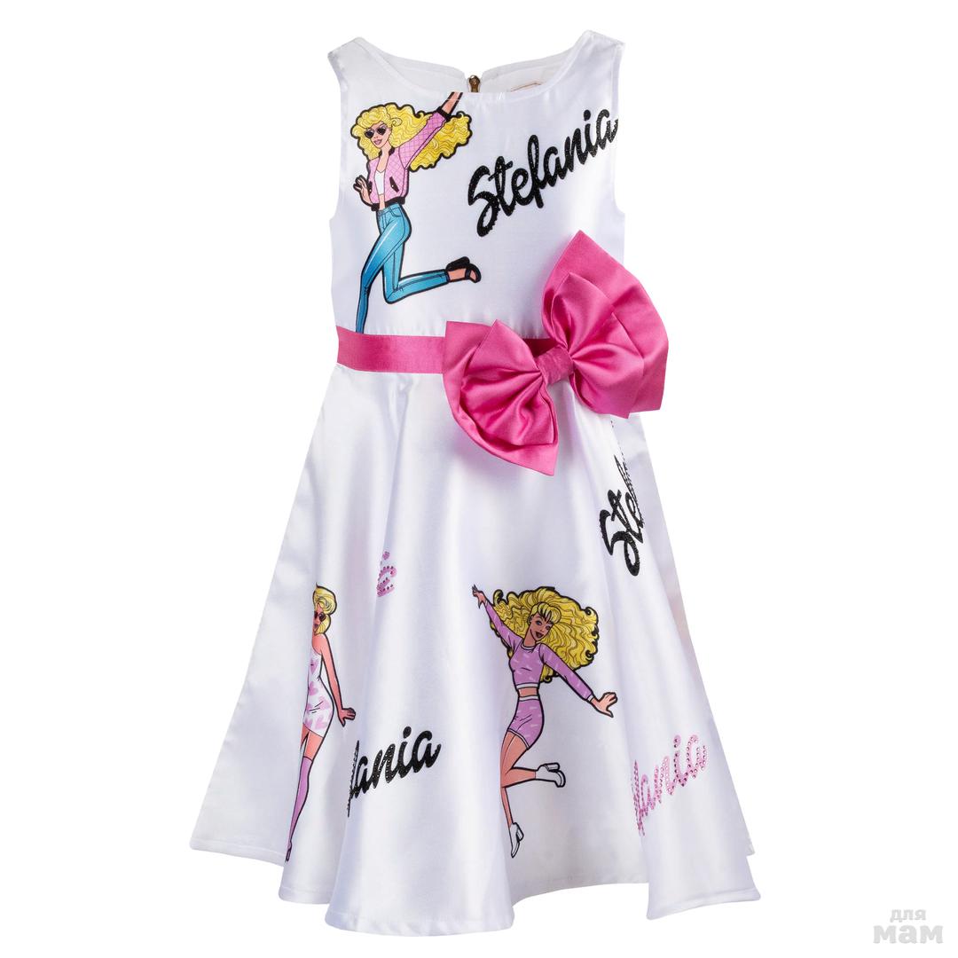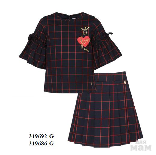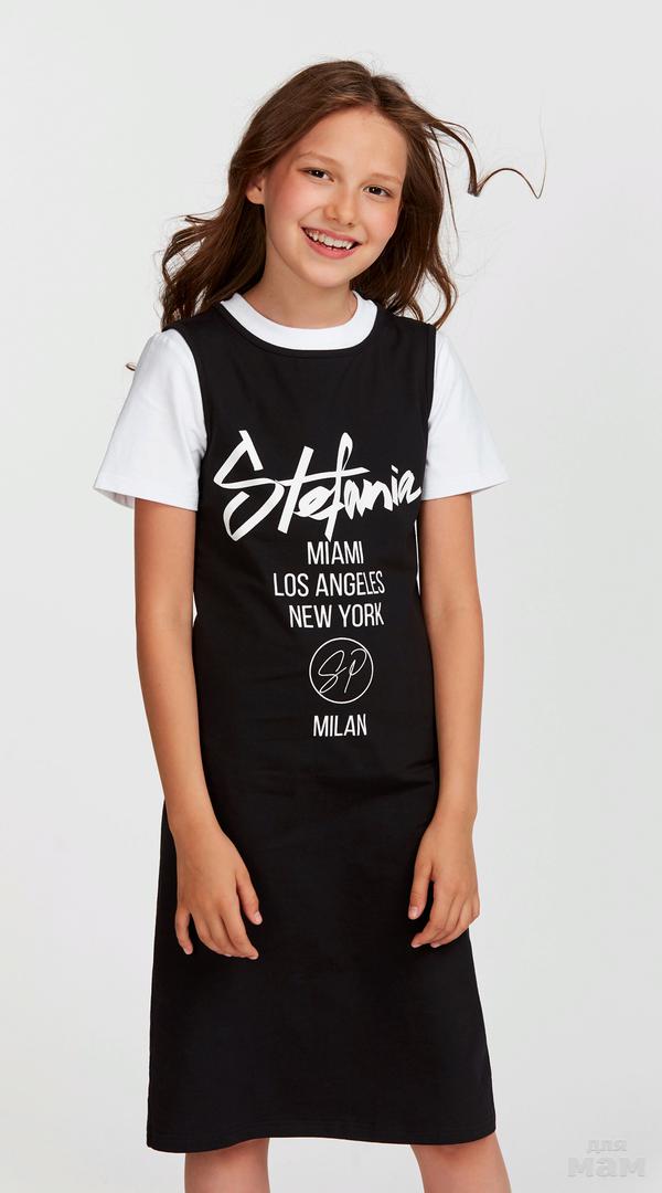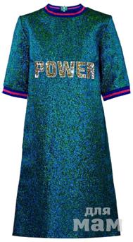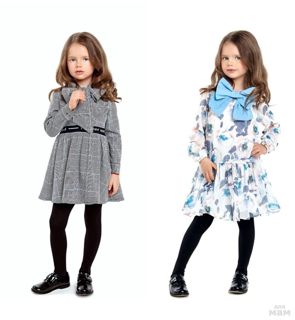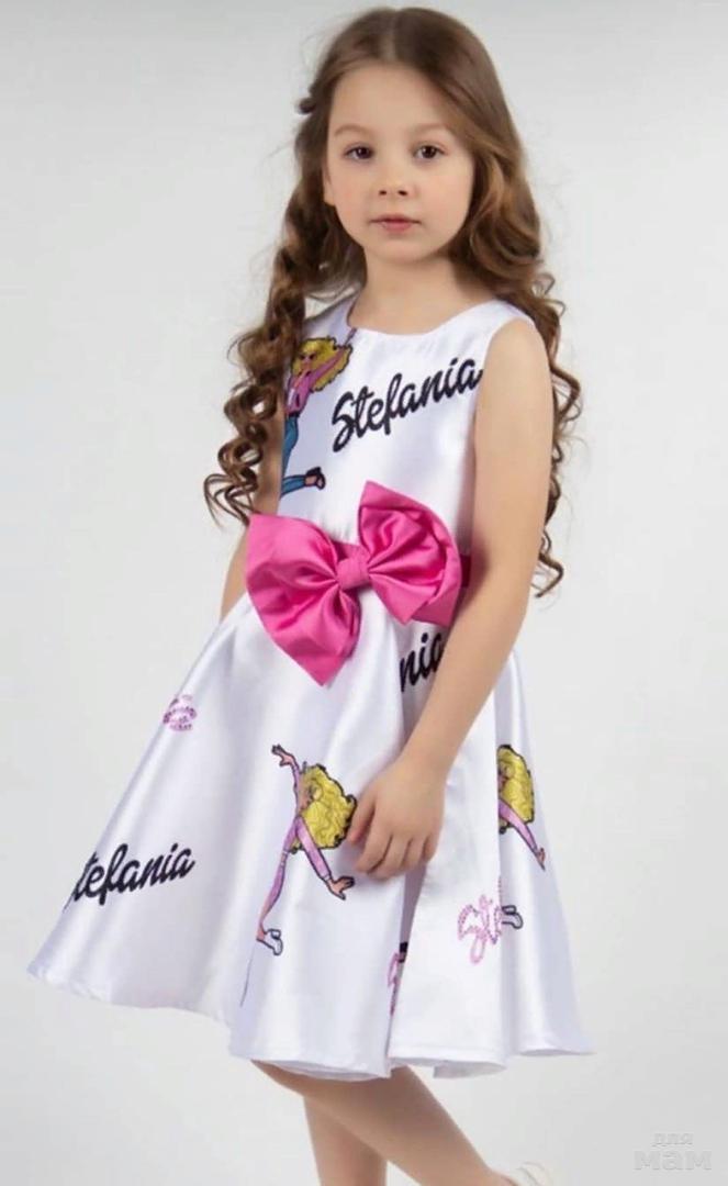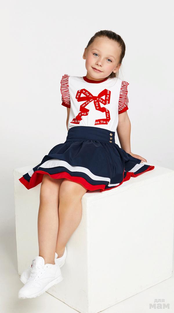 Комбинированное платье из костюмной ткани с круглым вырезом и длинным ирукавом. На лицевой стороне изделия вышита надпись, также платье декорировано бантом из ткани того жэе качества. Сзади застегивается на потайную молнию. Манжеты выполнены из резинки синего цвета