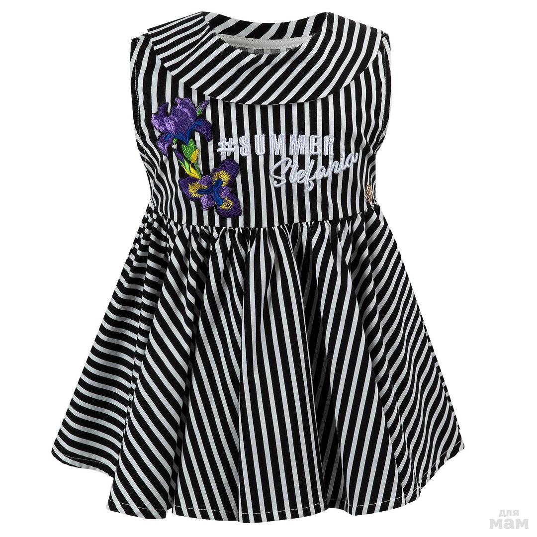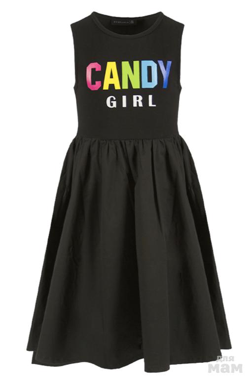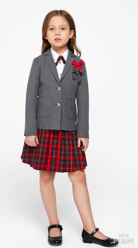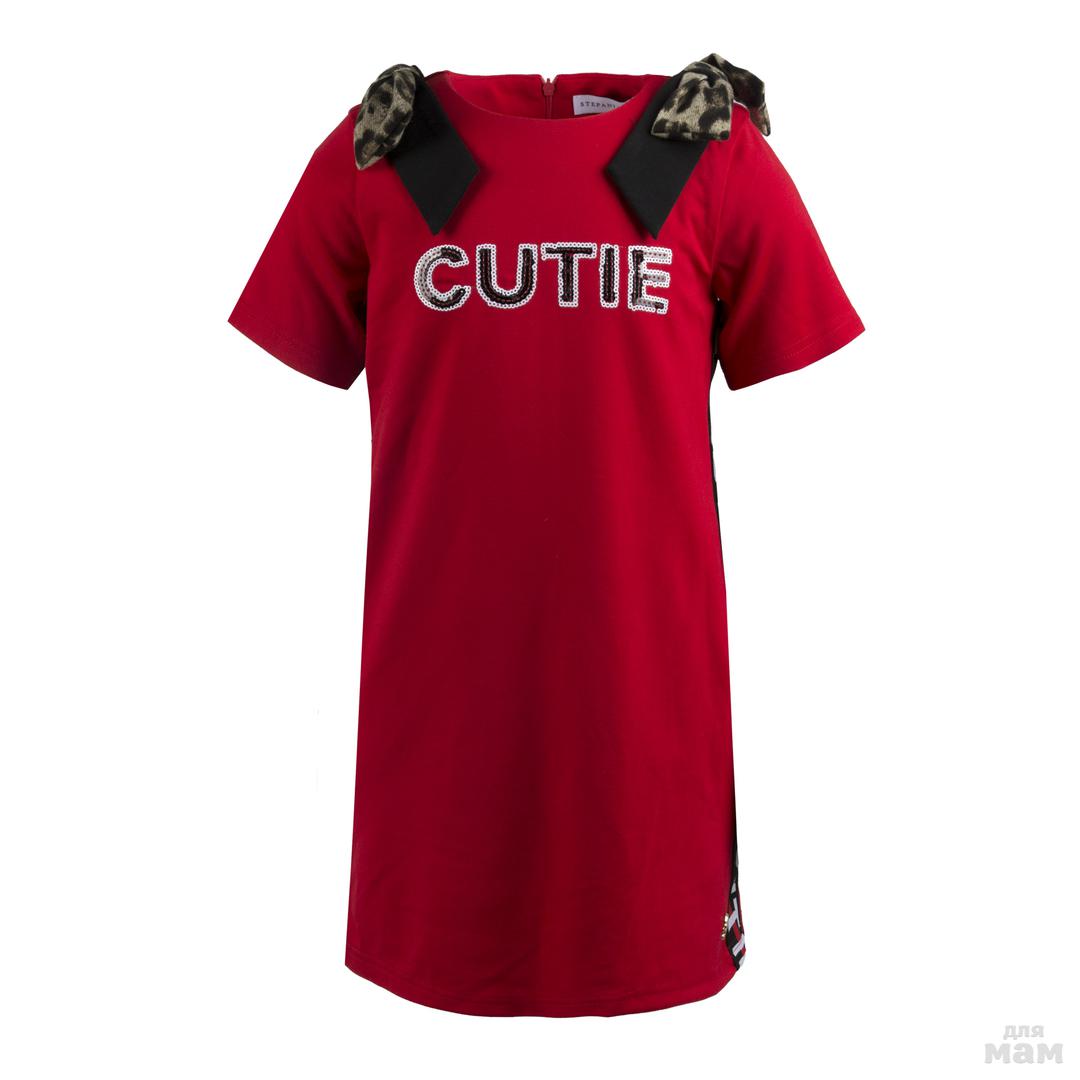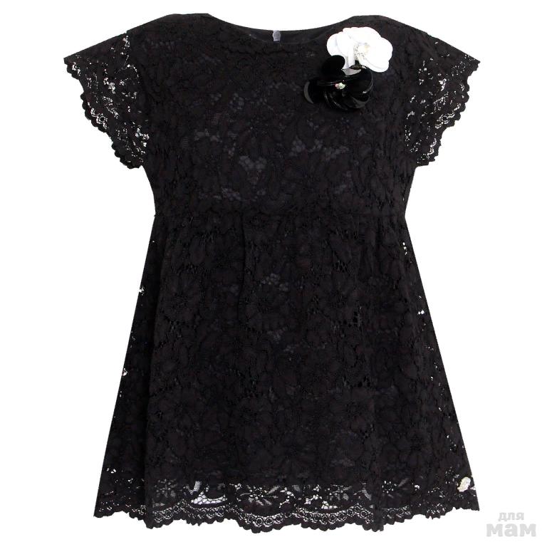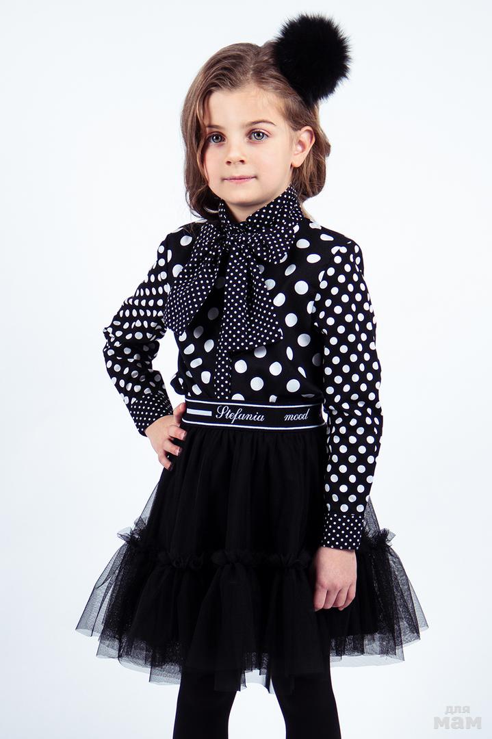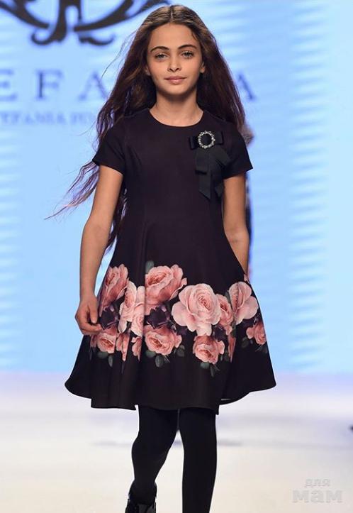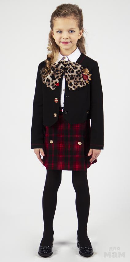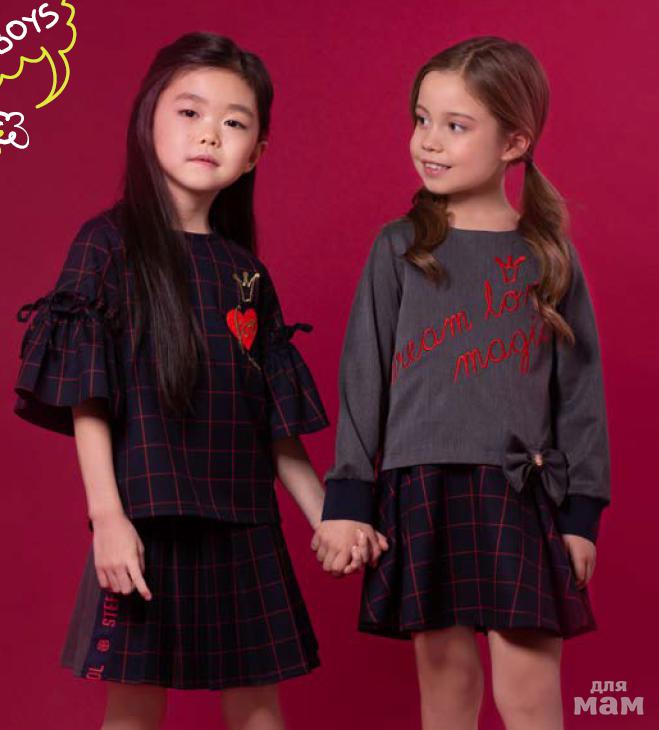 Комбинированное платье из костюмной ткани с круглым вырезом и длинным ирукавом. На лицевой стороне изделия вышита надпись, также платье декорировано бантом из ткани того жэе качества. Сзади застегивается на потайную молнию. Манжеты выполнены из резинки синего цвета