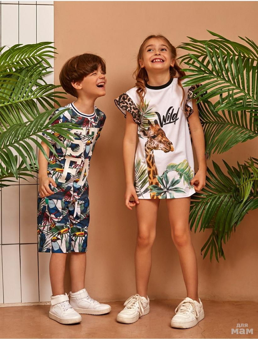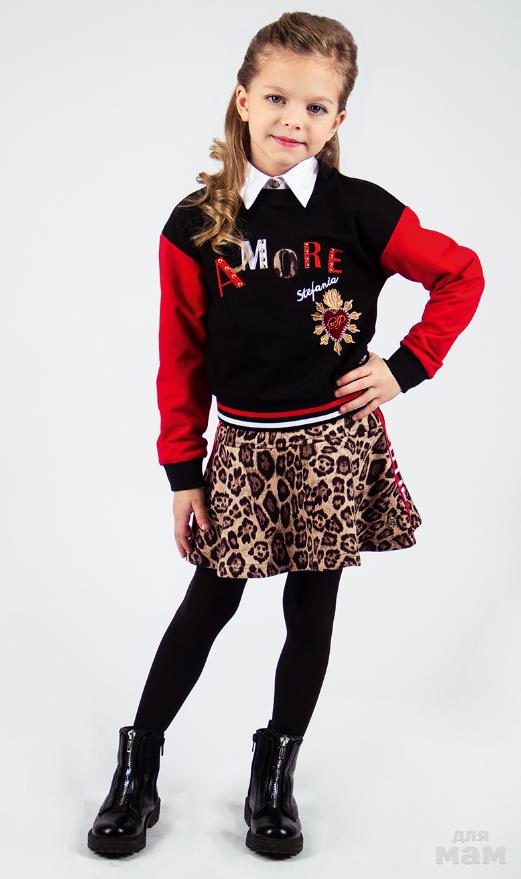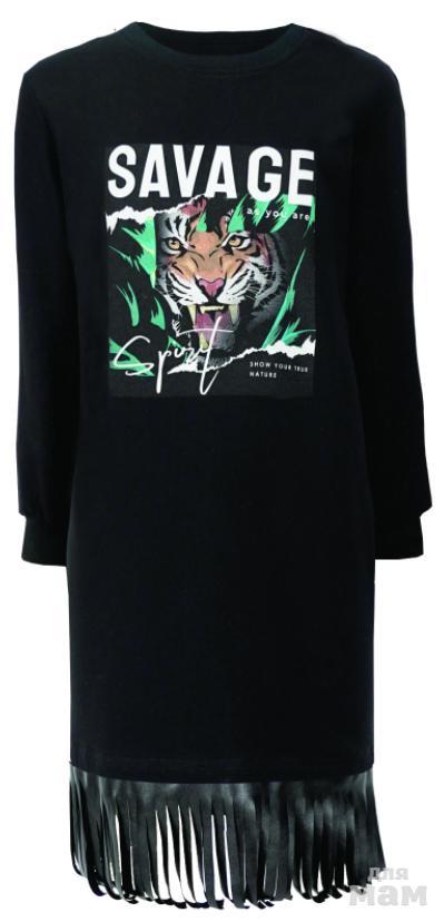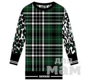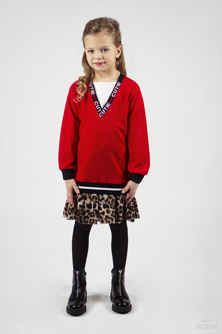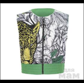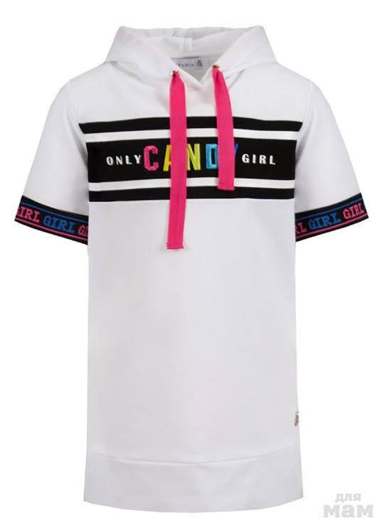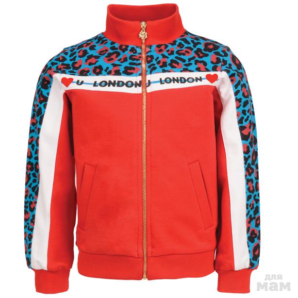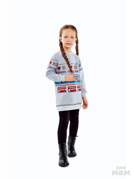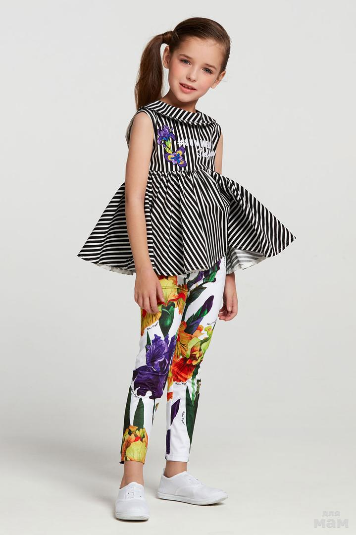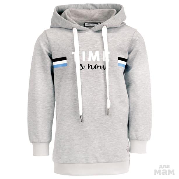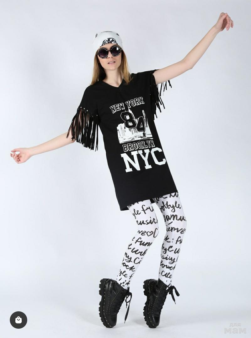 Туника из френч-терри, с длинными рукавами, V-образной горловиной и разрезом на переде. Рукава отделаны принтованными лампасами и манжетами из рибаны в контрастную полоску. На переде и нижней планке разреза крупные контрастные принты.