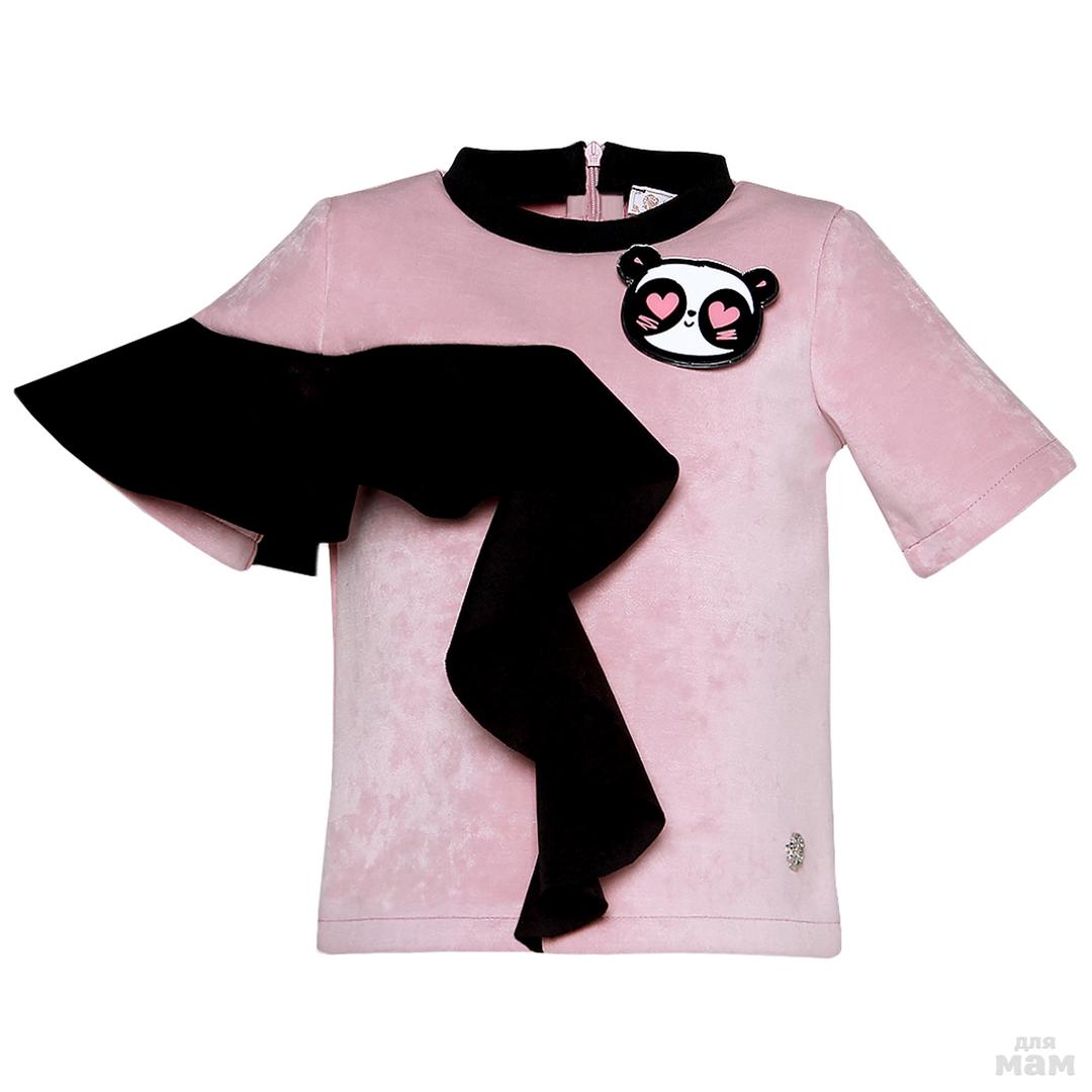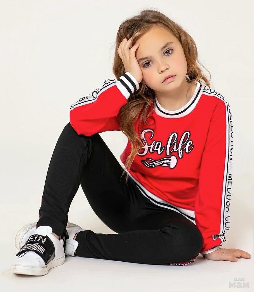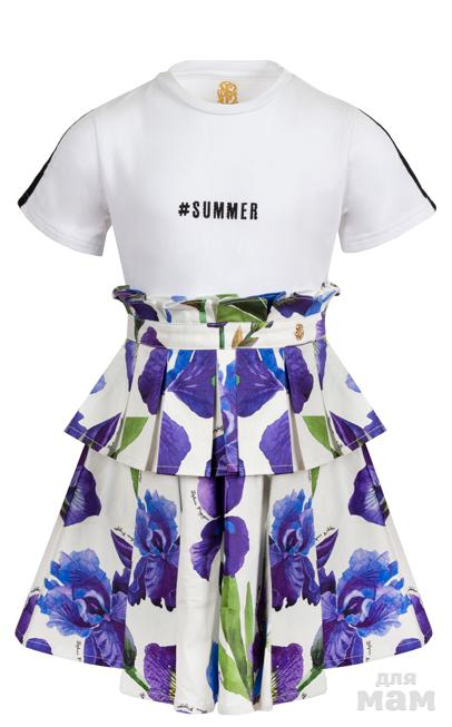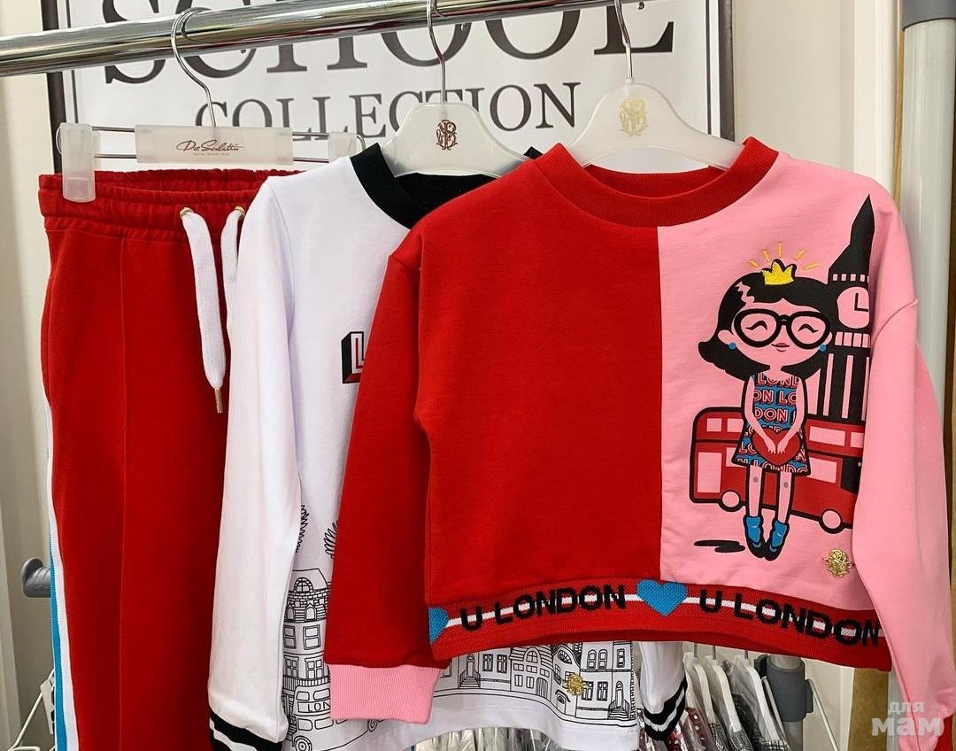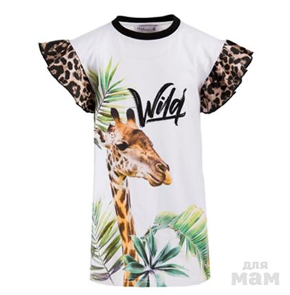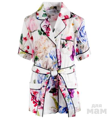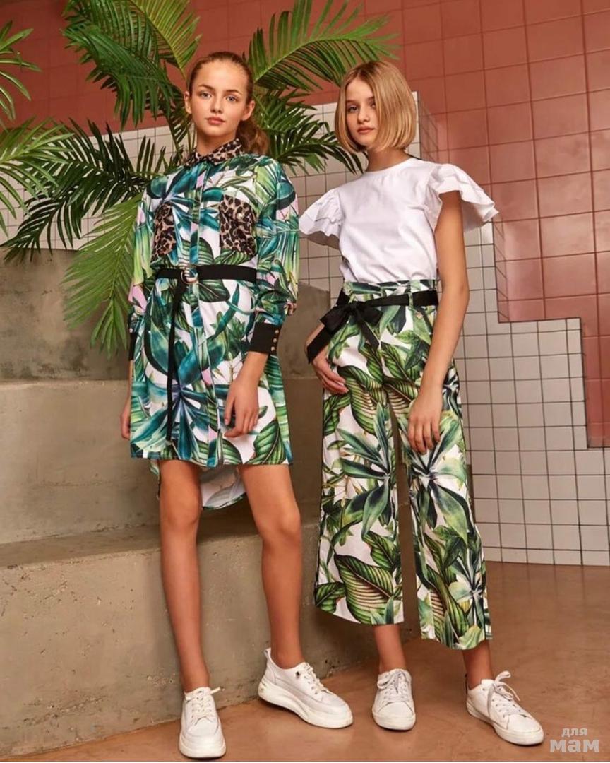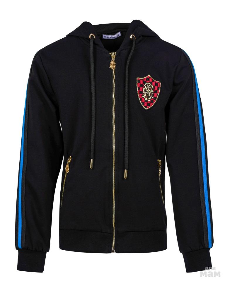 Туника из френч-терри, с длинными рукавами, V-образной горловиной и разрезом на переде. Рукава отделаны принтованными лампасами и манжетами из рибаны в контрастную полоску. На переде и нижней планке разреза крупные контрастные принты.
