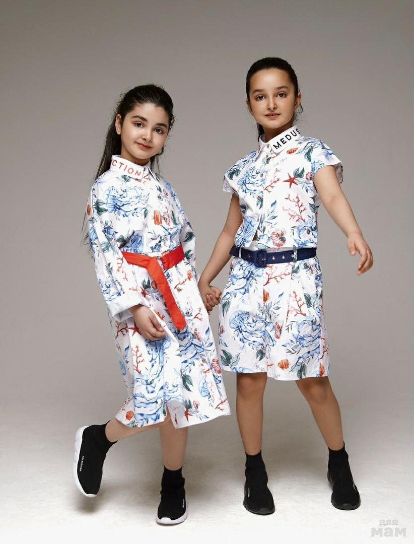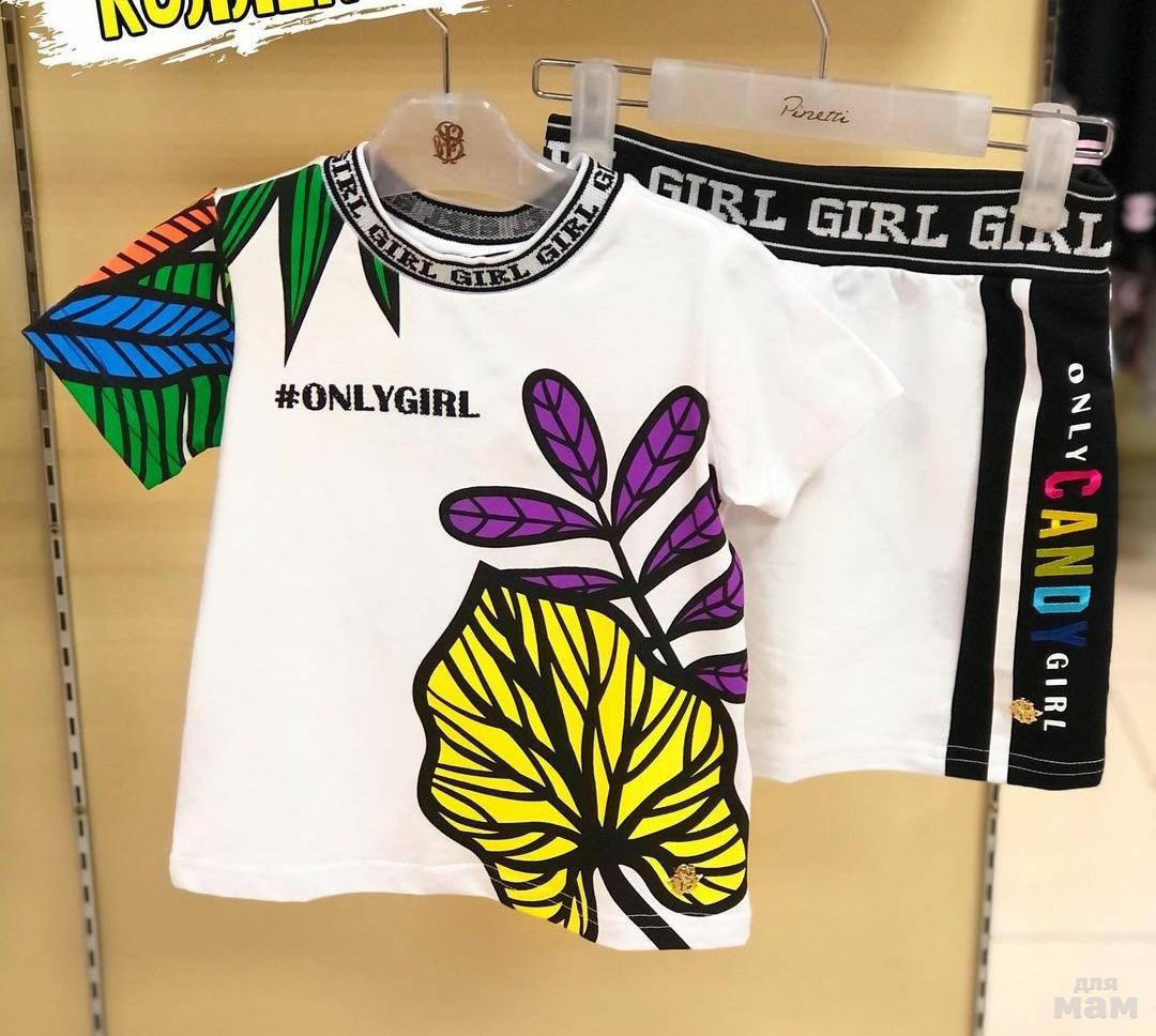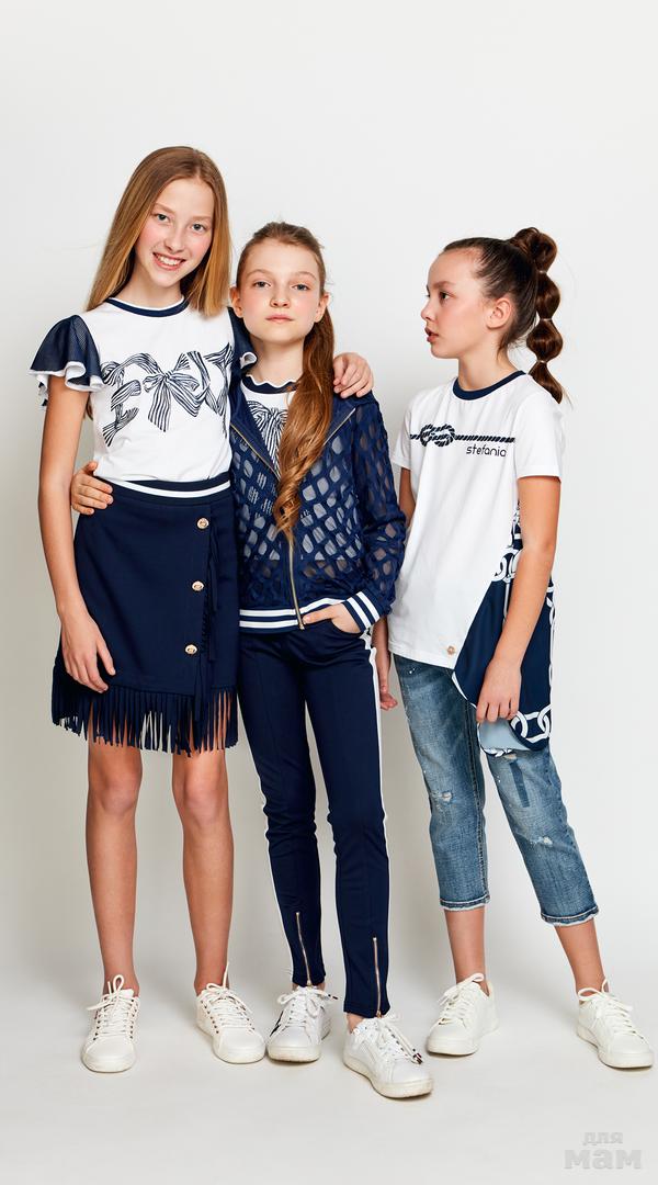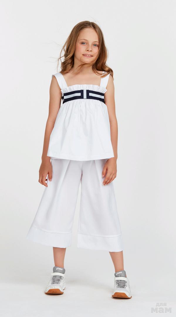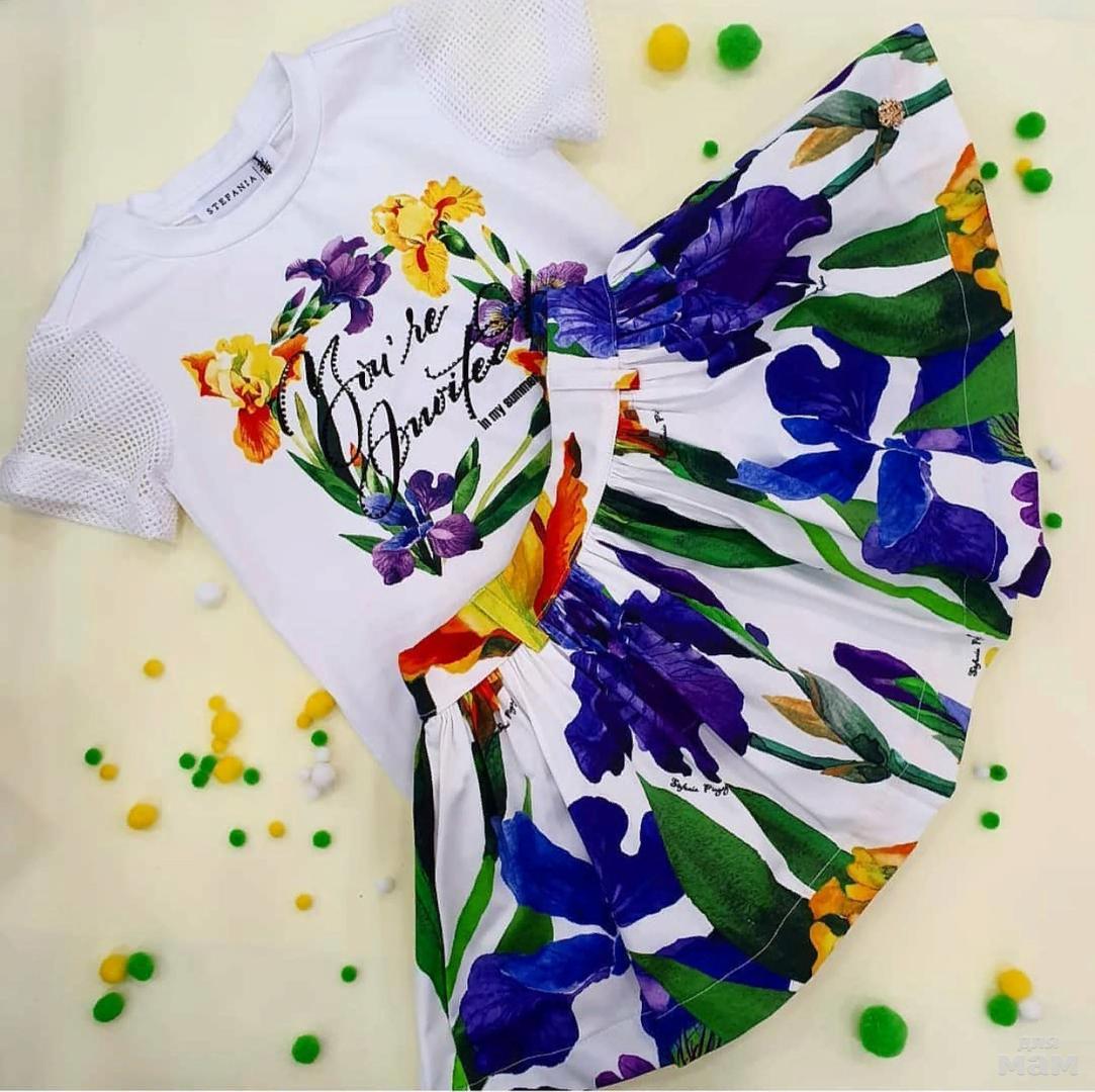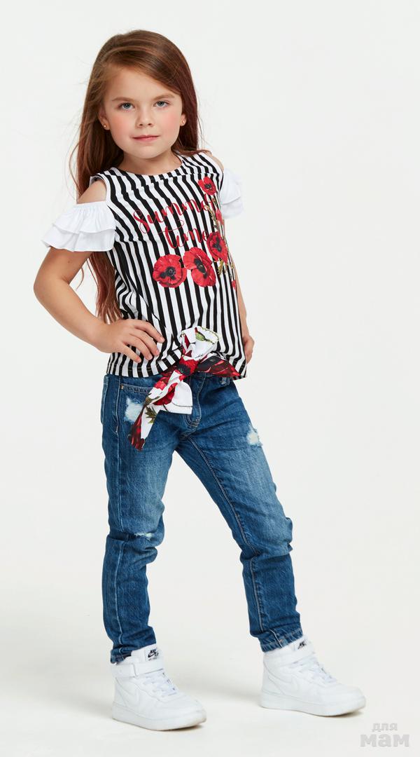 Туника из френч-терри, с длинными рукавами, V-образной горловиной и разрезом на переде. Рукава отделаны принтованными лампасами и манжетами из рибаны в контрастную полоску. На переде и нижней планке разреза крупные контрастные принты.