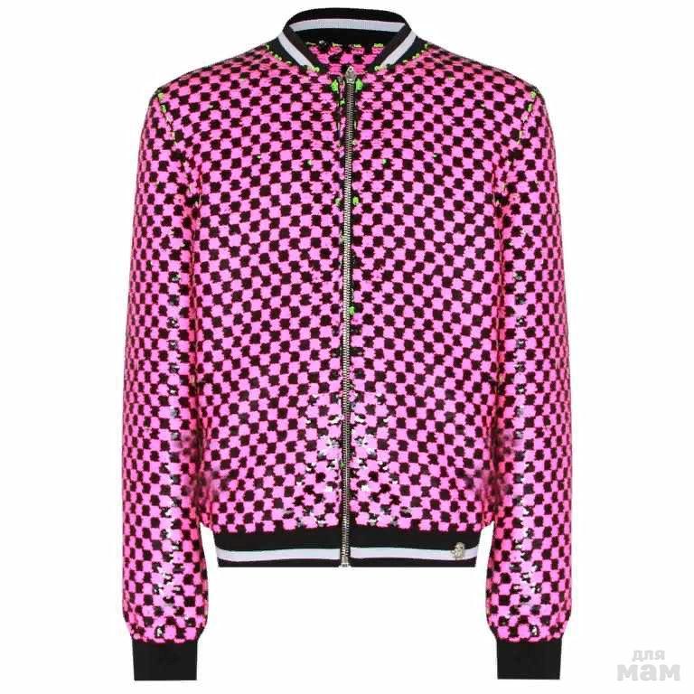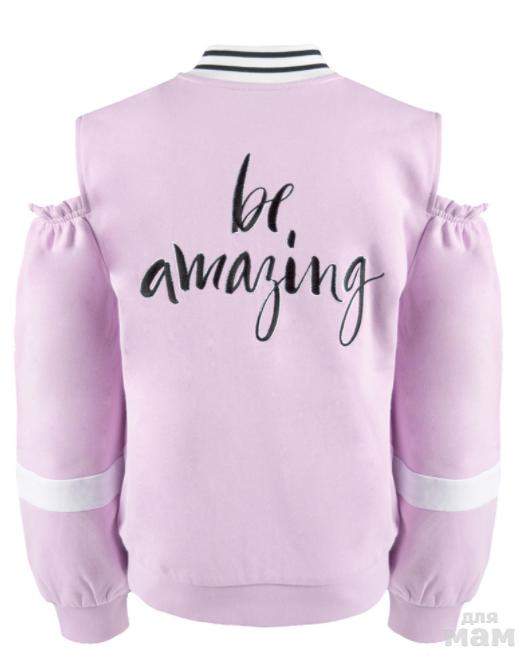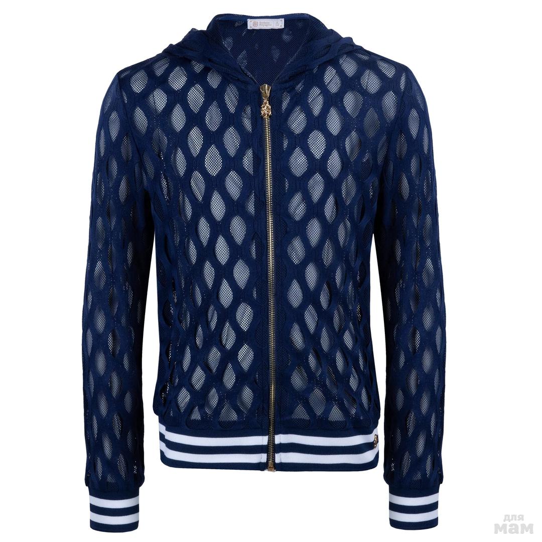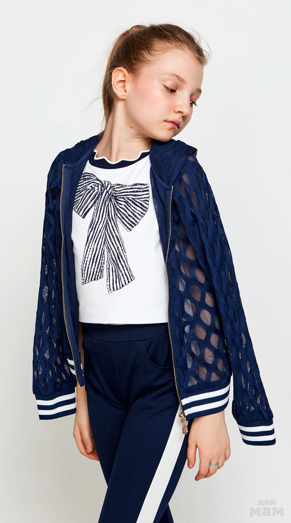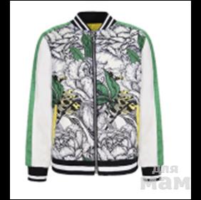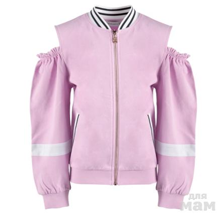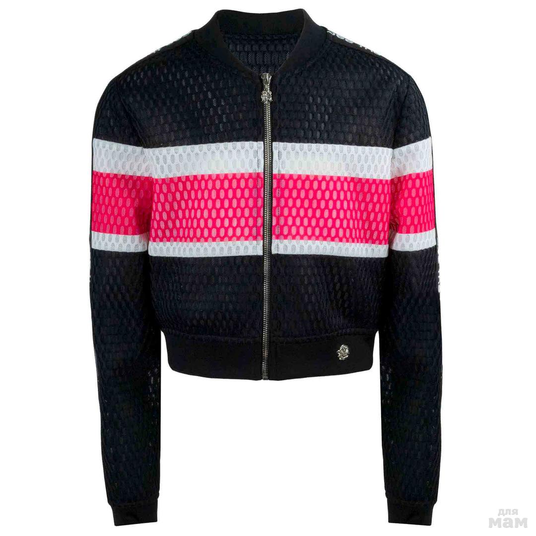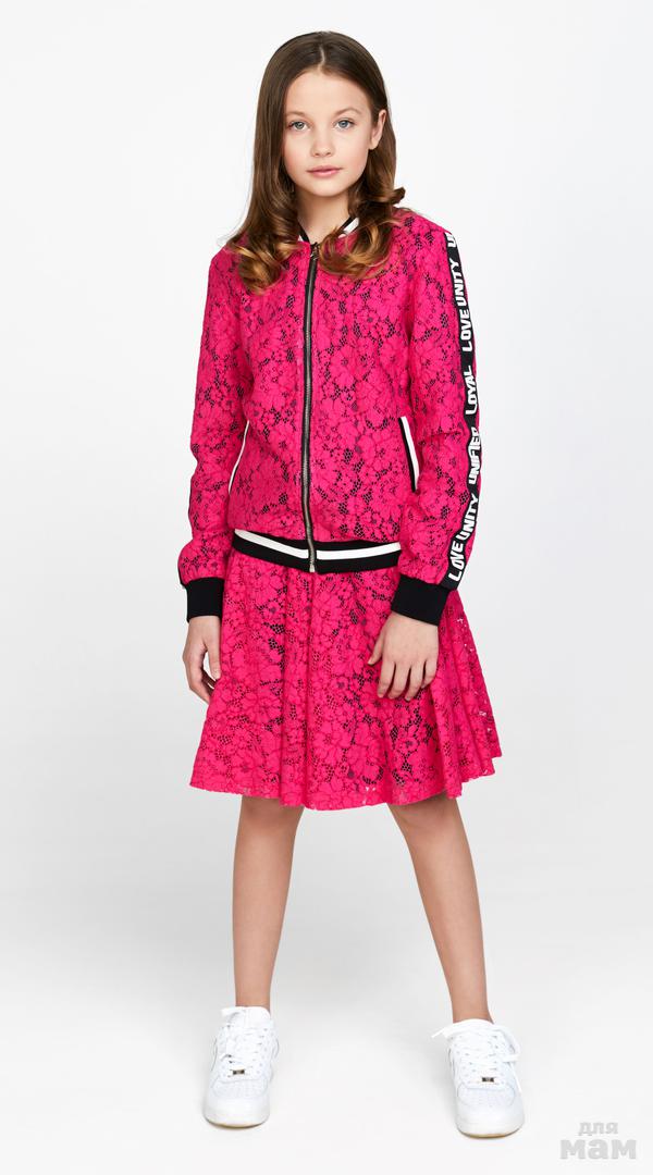 Бомбер из кордового гипюра, на молнии, на контрастной подкладке. Длинные рукава отделаны лампасами из контрастной тесьмы с надписями. Воротник, листочки боковых карманов и низ изделия из рибаны в полоску, низ рукавов из чёрной рибаны.