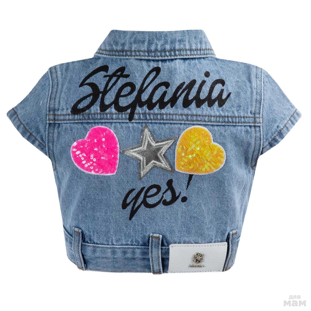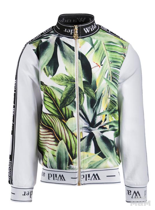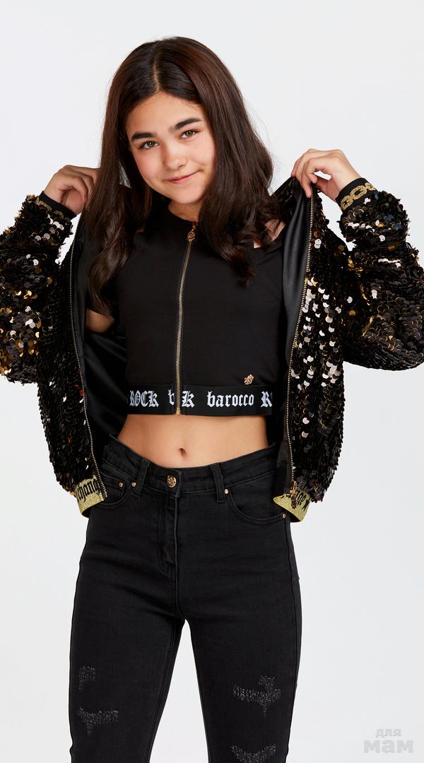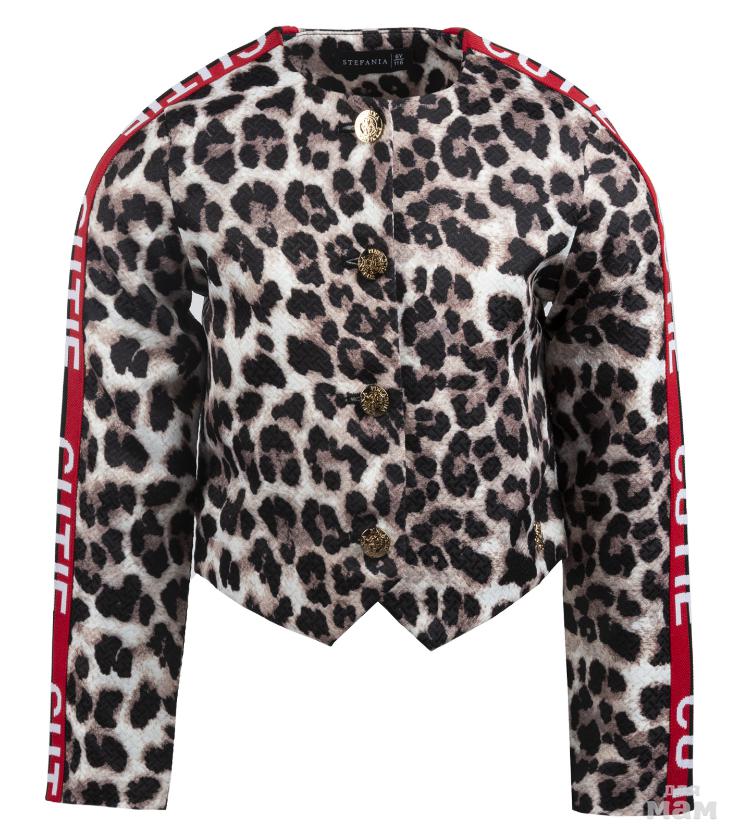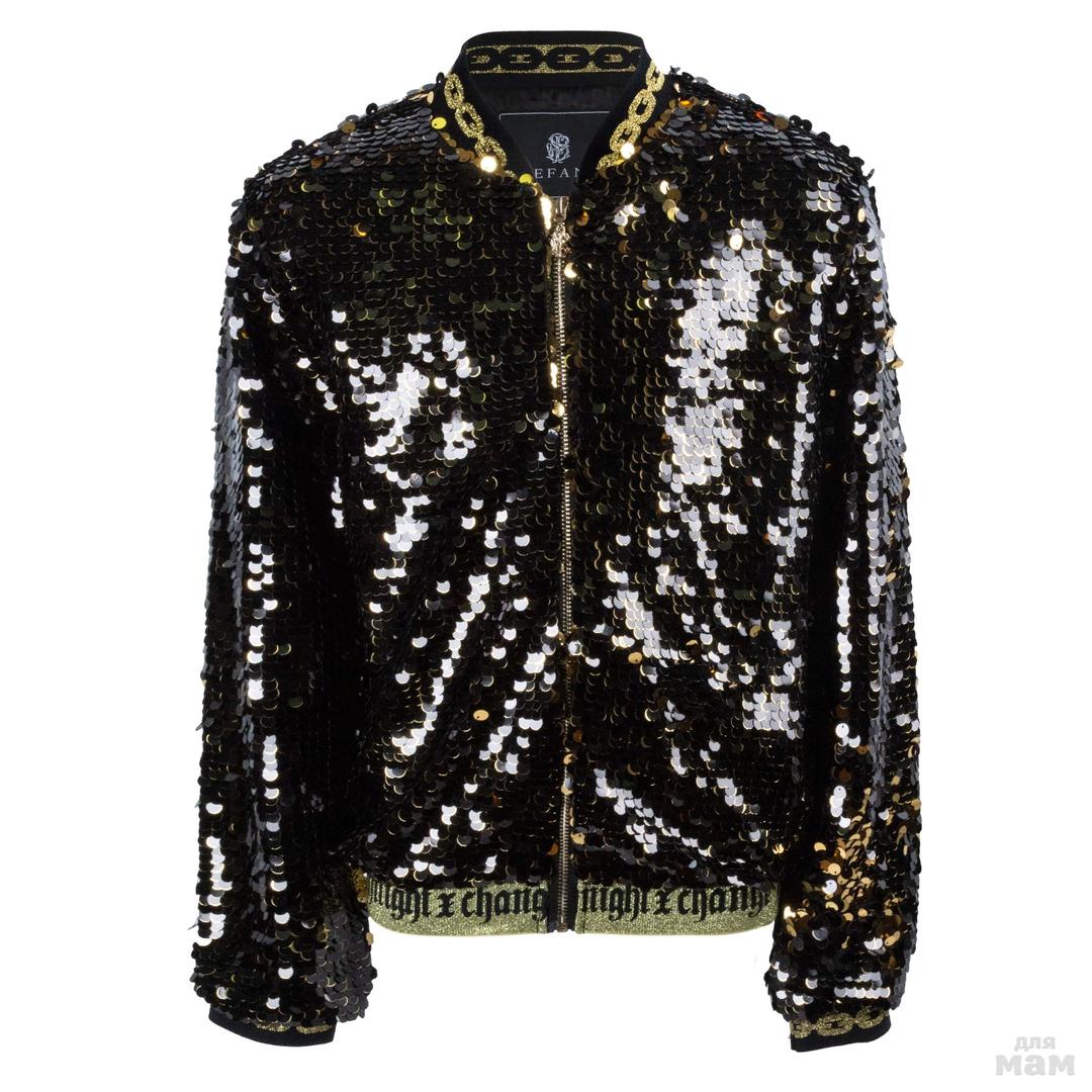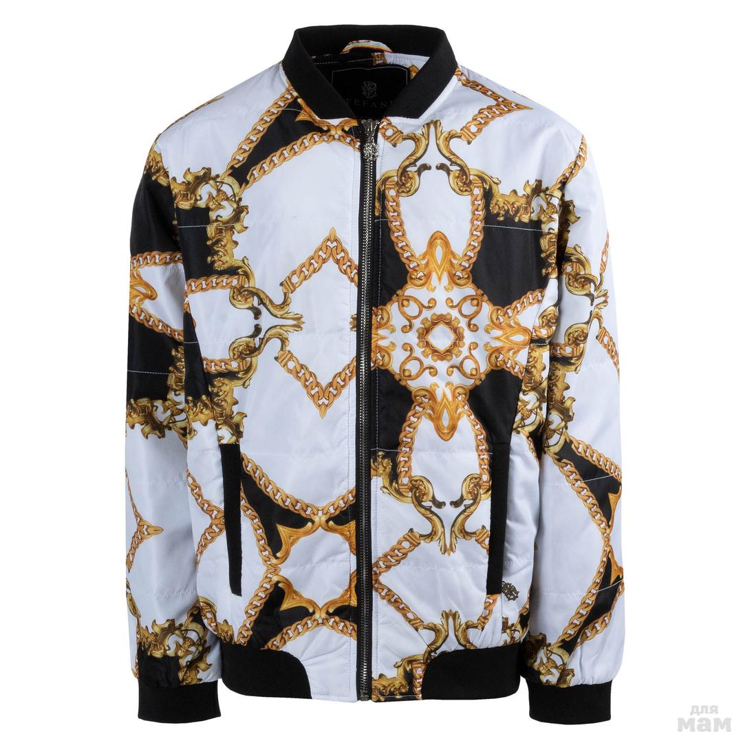 Бомбер из кордового гипюра, на молнии, на контрастной подкладке. Длинные рукава отделаны лампасами из контрастной тесьмы с надписями. Воротник, листочки боковых карманов и низ изделия из рибаны в полоску, низ рукавов из чёрной рибаны.
