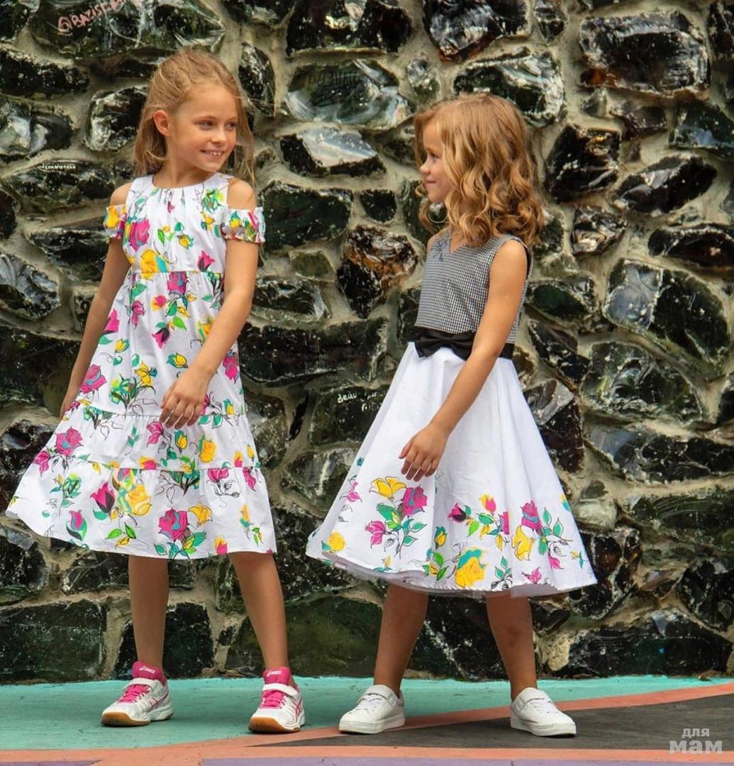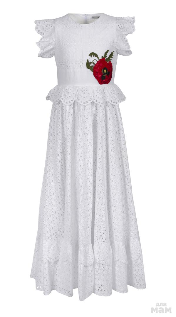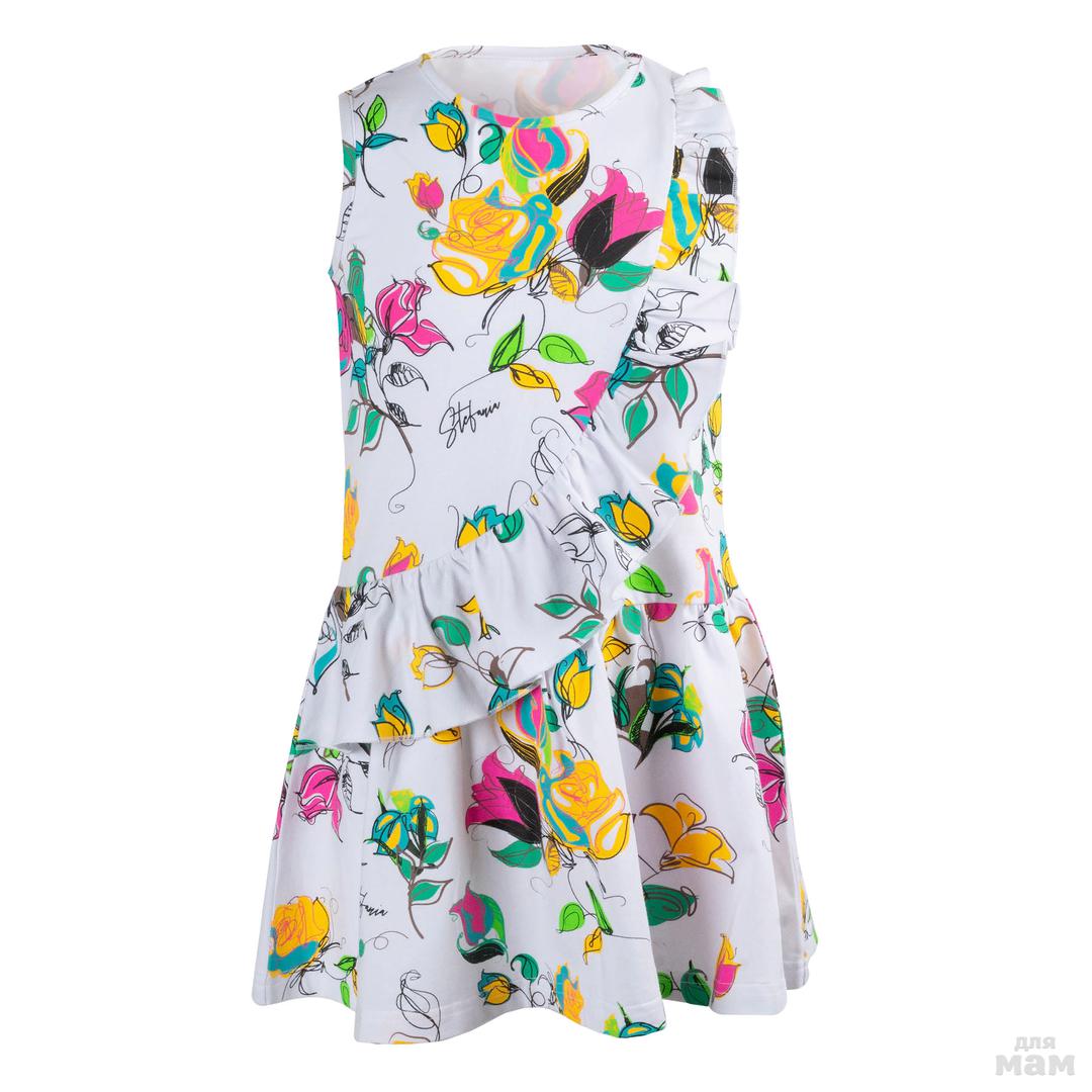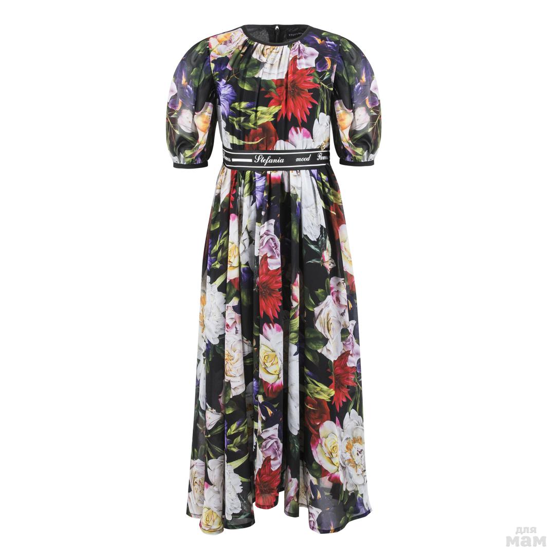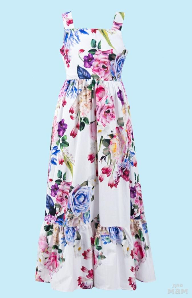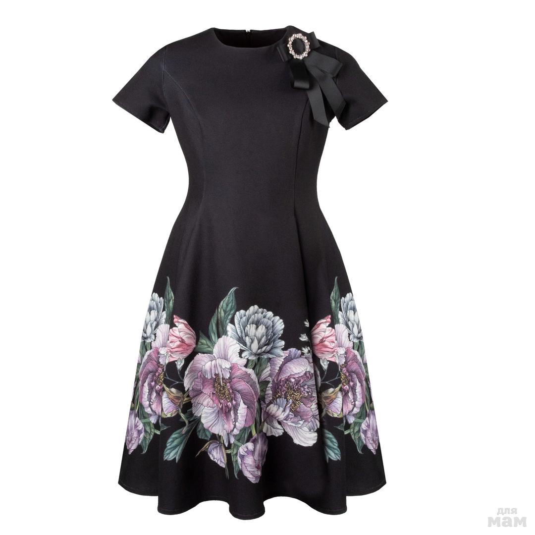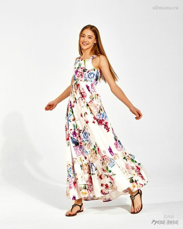 Приталенное платье без рукавов из сатина, на хлопковой подкладке, с пышной юбкой из рядов оборок из чёрной органзы. Лиф из сатина с цветочным принтом отделан по талии чёрной бархатной тесьмой. В среднем шве спинки потайная молния.
