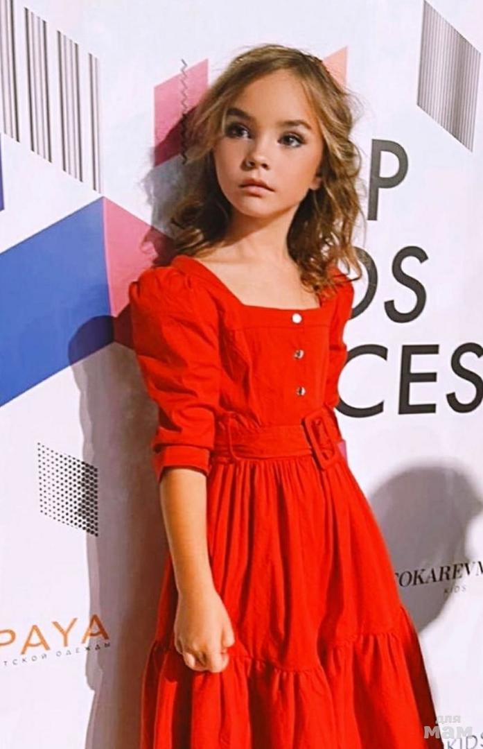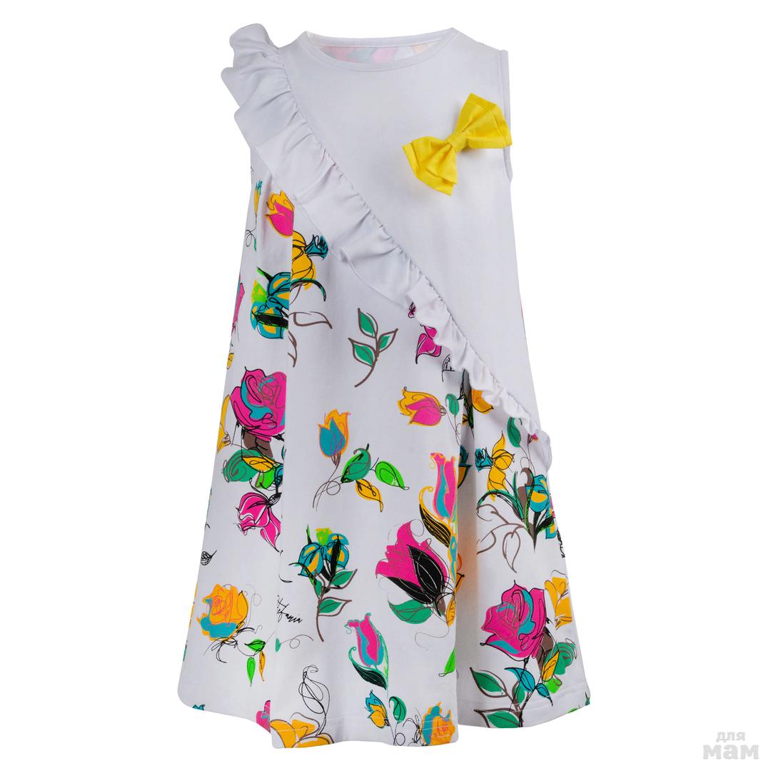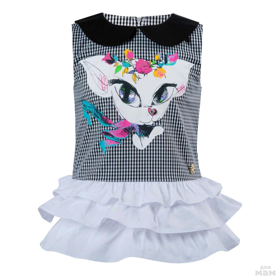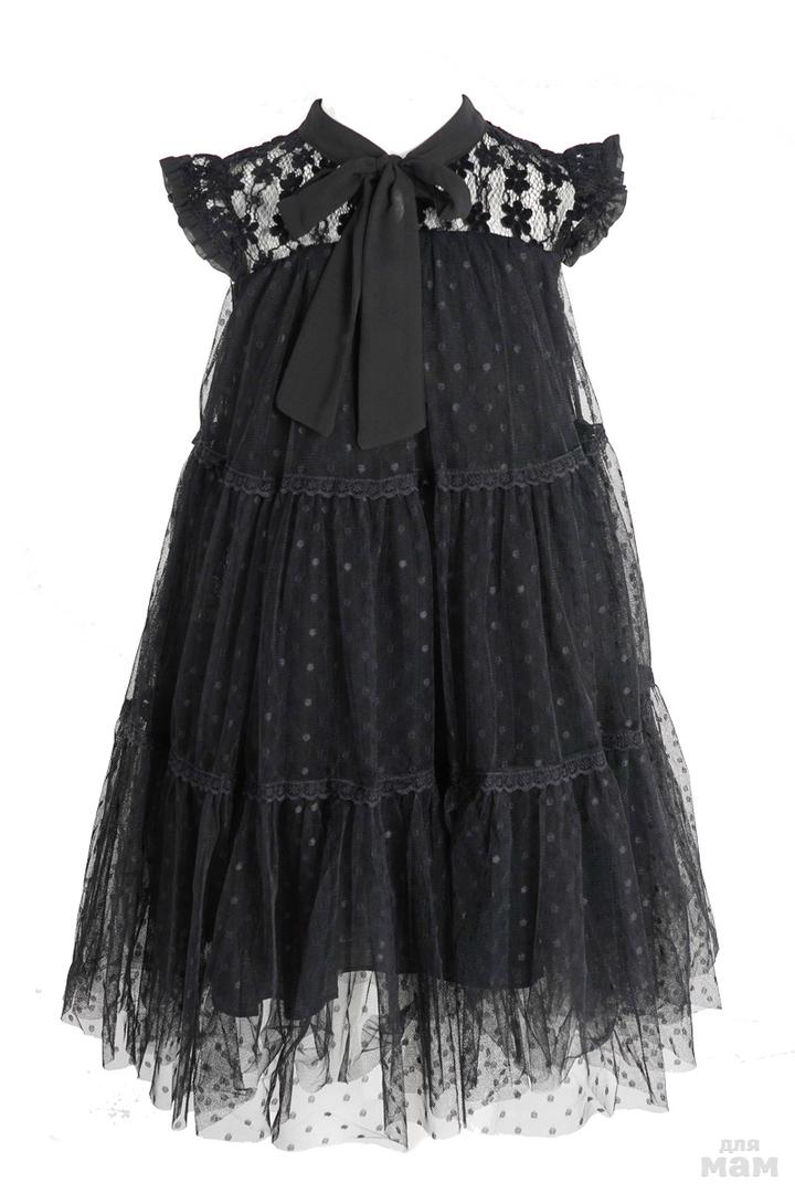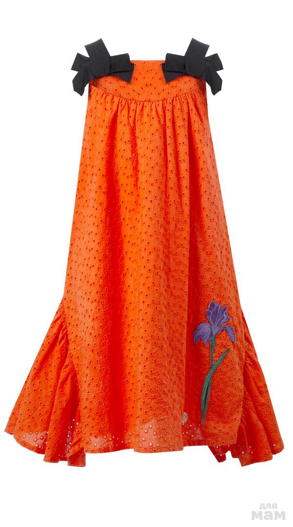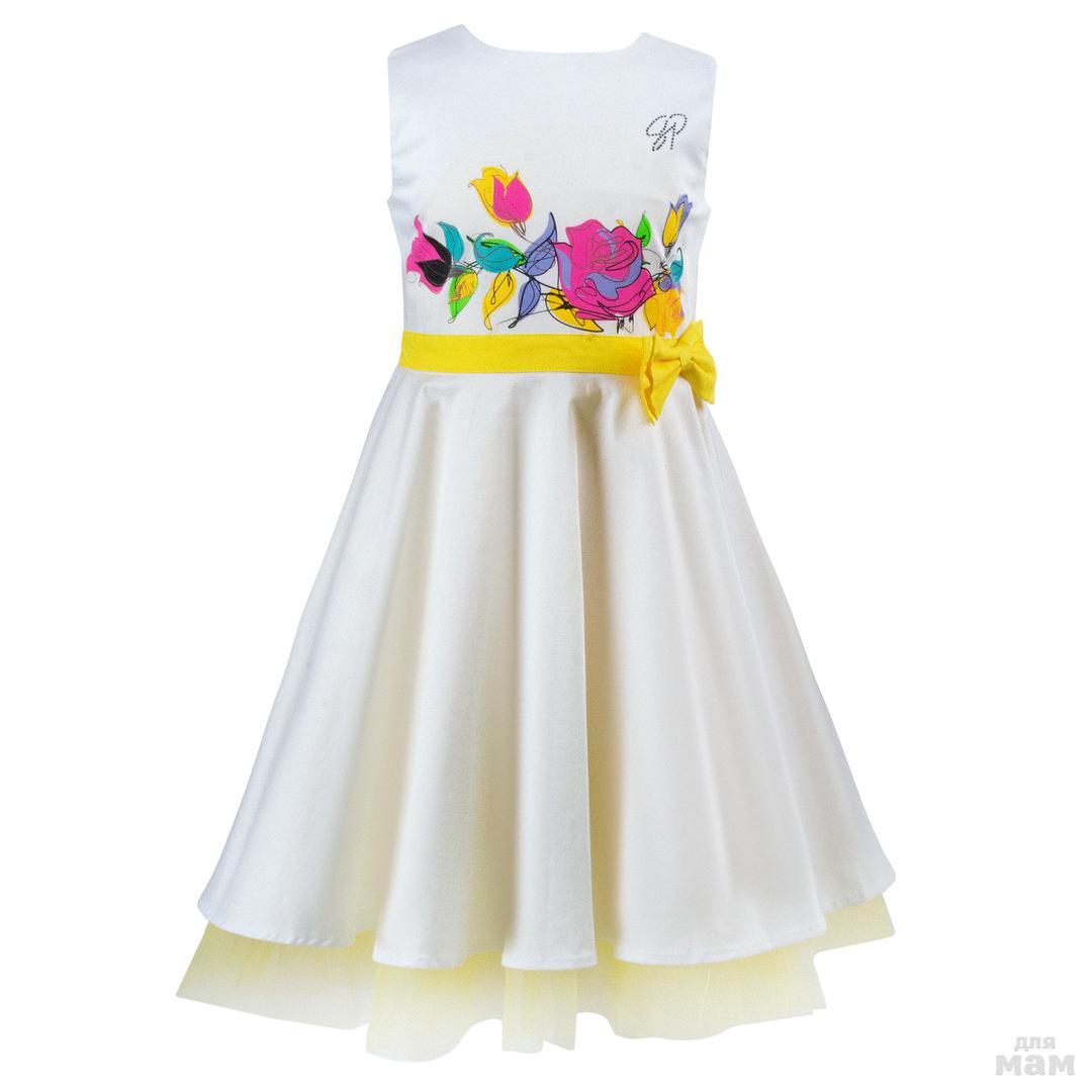 Приталенное платье без рукавов из сатина, на хлопковой подкладке, с пышной юбкой из рядов оборок из чёрной органзы. Лиф из сатина с цветочным принтом отделан по талии чёрной бархатной тесьмой. В среднем шве спинки потайная молния.