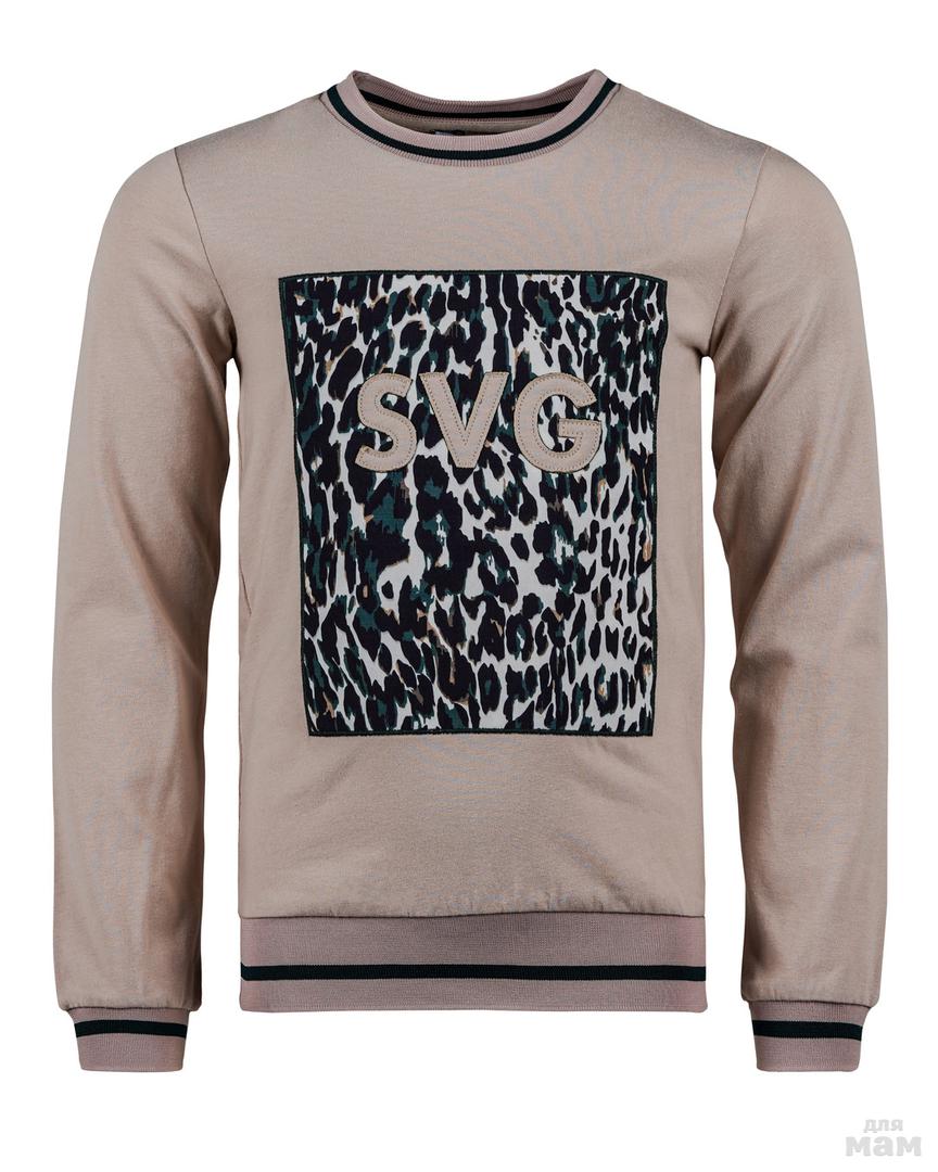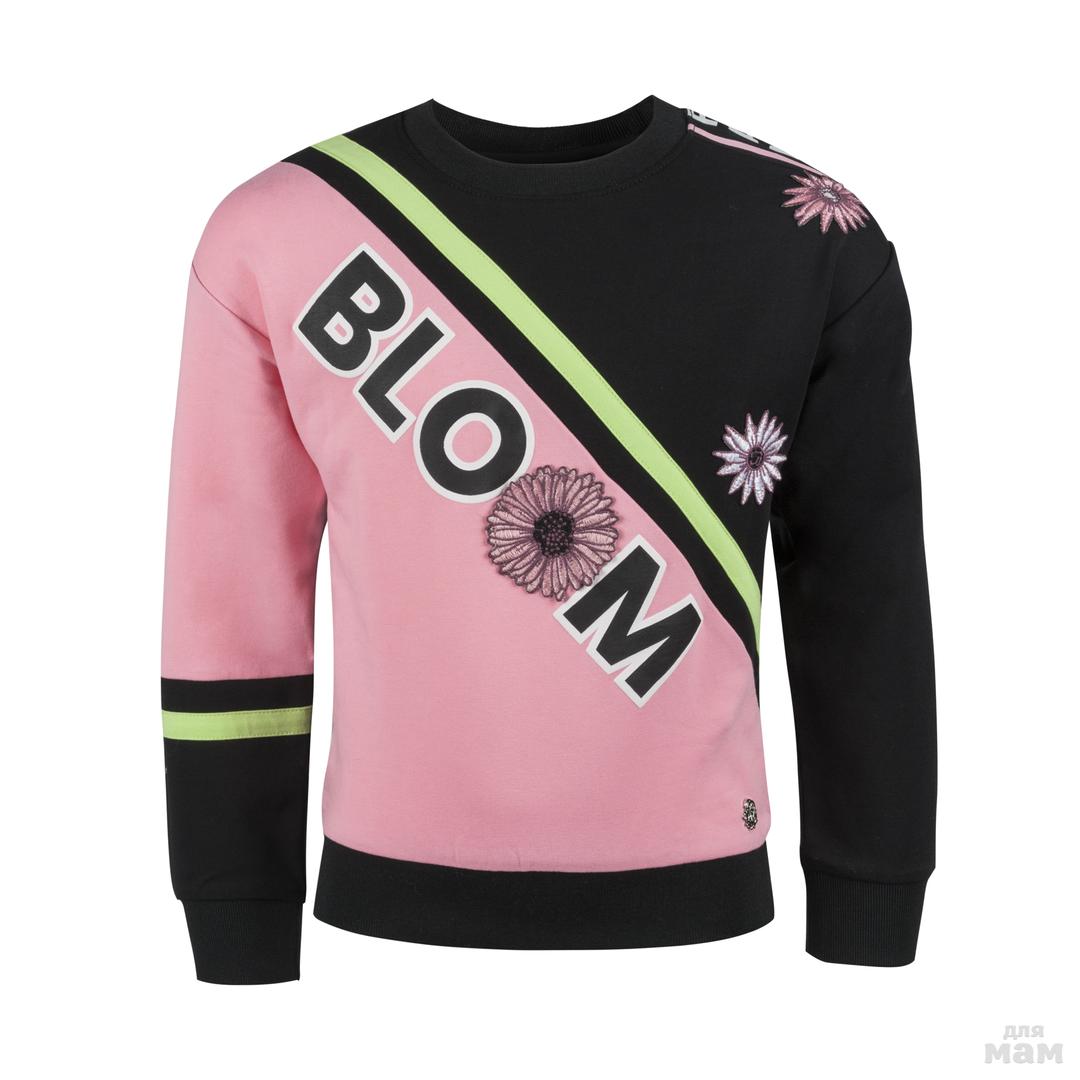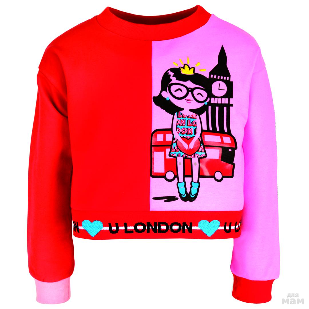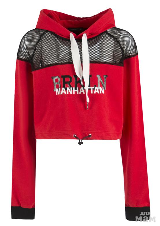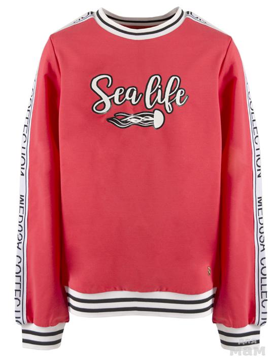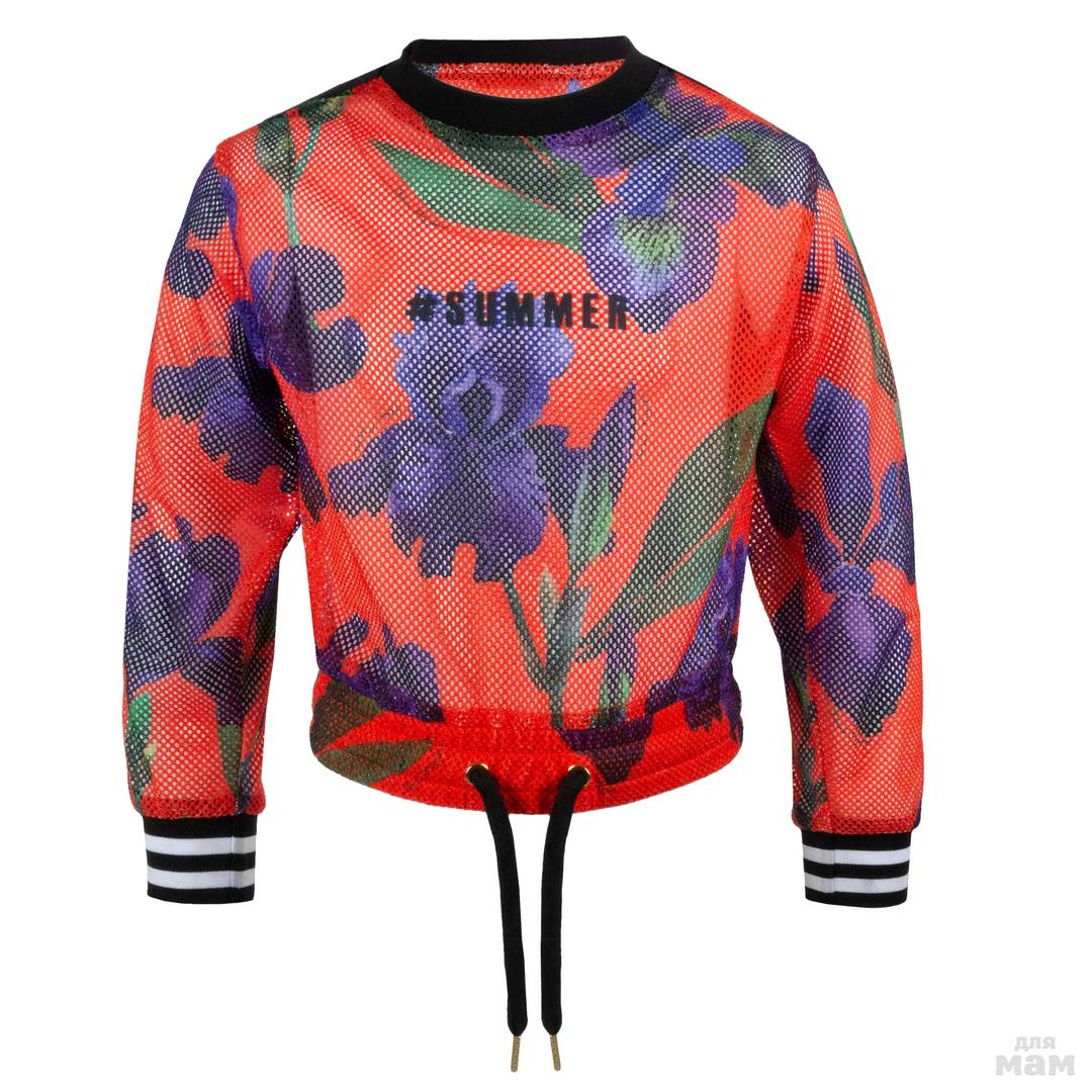 Свитшот из джерси, с длинными рукавами, крупным контрастным принтом в виде надписей на переде и лампасами из крупной сетки с контрастной подложкой. Горловина и низ изделия обработаны чёрной рибаной, низ рукавов - рибаной в контрастную полоску.