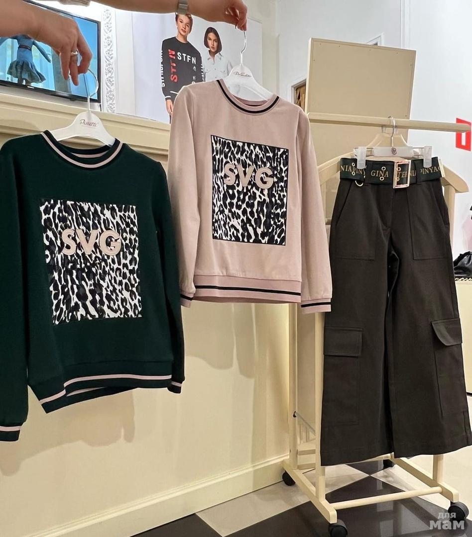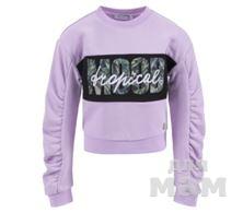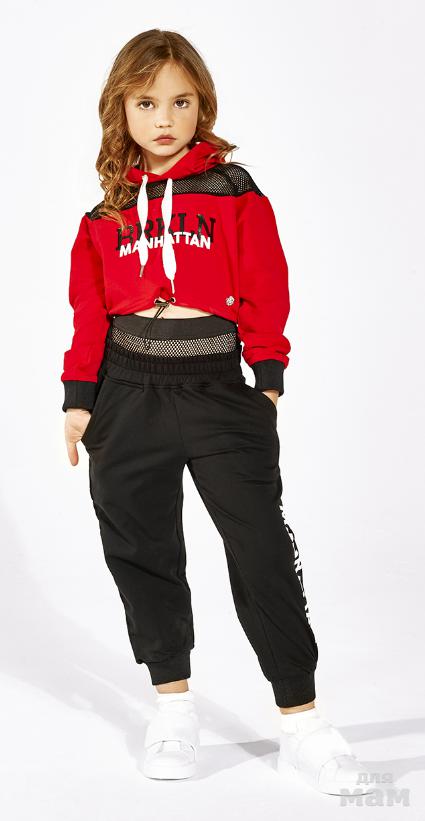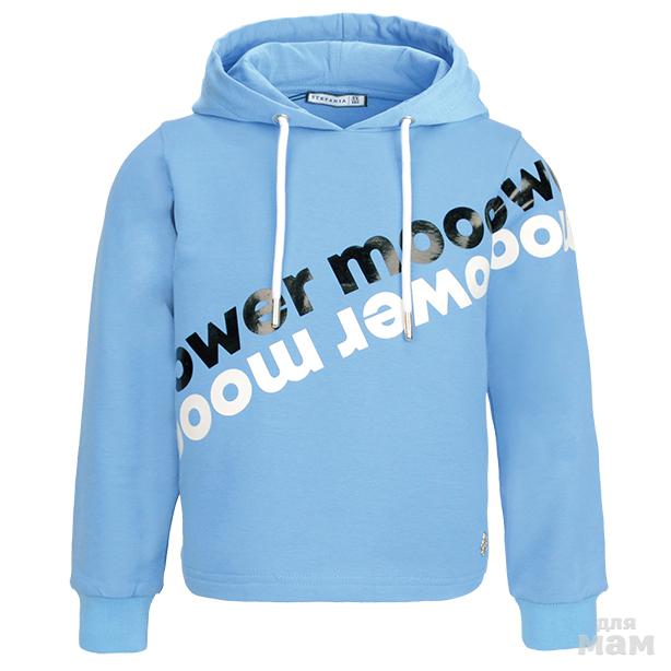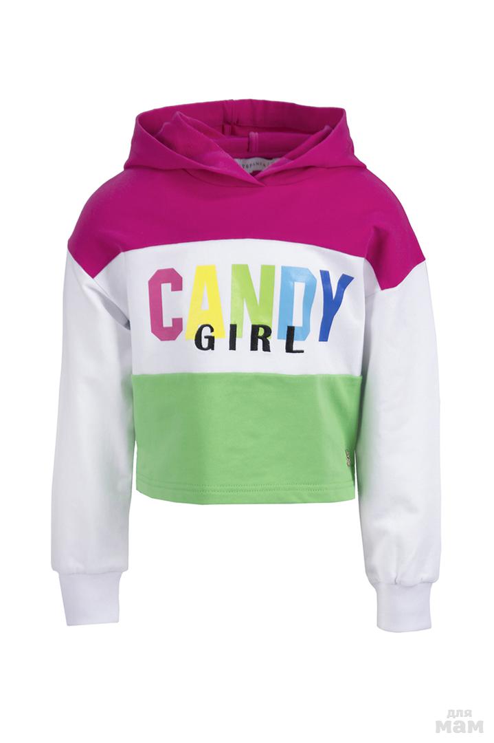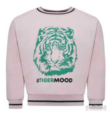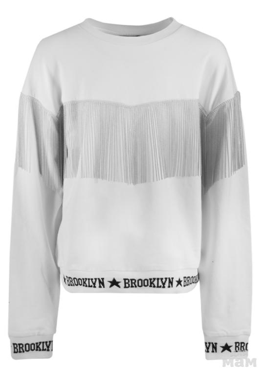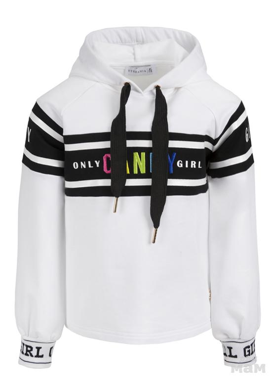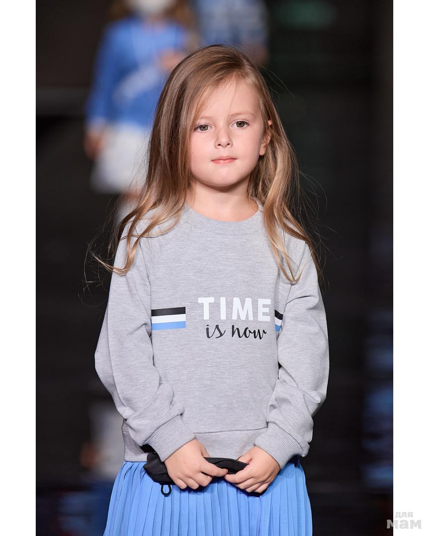 Свитшот из джерси, с длинными рукавами, крупным контрастным принтом в виде надписей на переде и лампасами из крупной сетки с контрастной подложкой. Горловина и низ изделия обработаны чёрной рибаной, низ рукавов - рибаной в контрастную полоску.