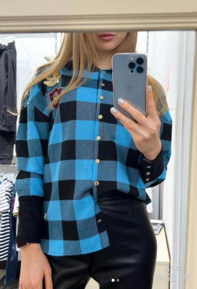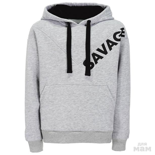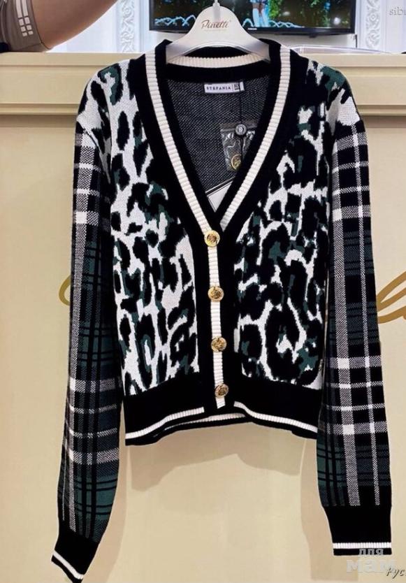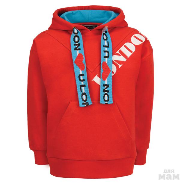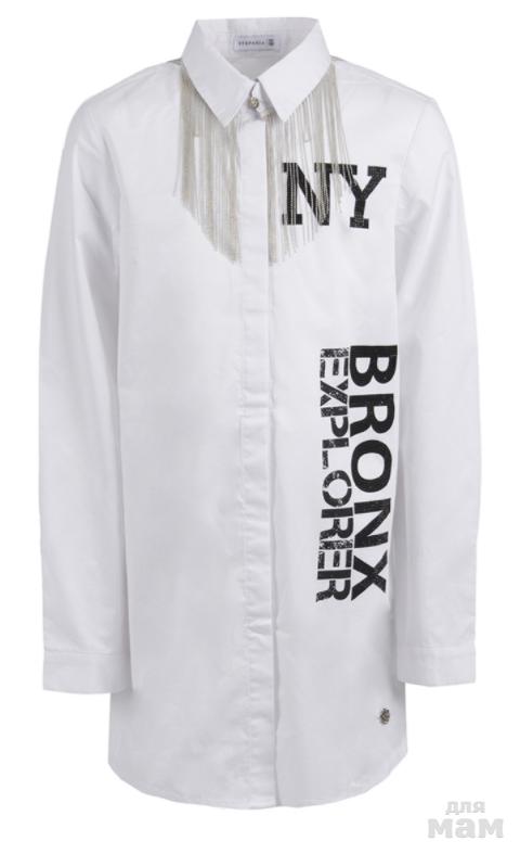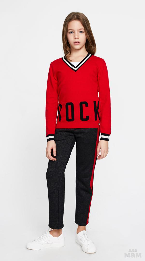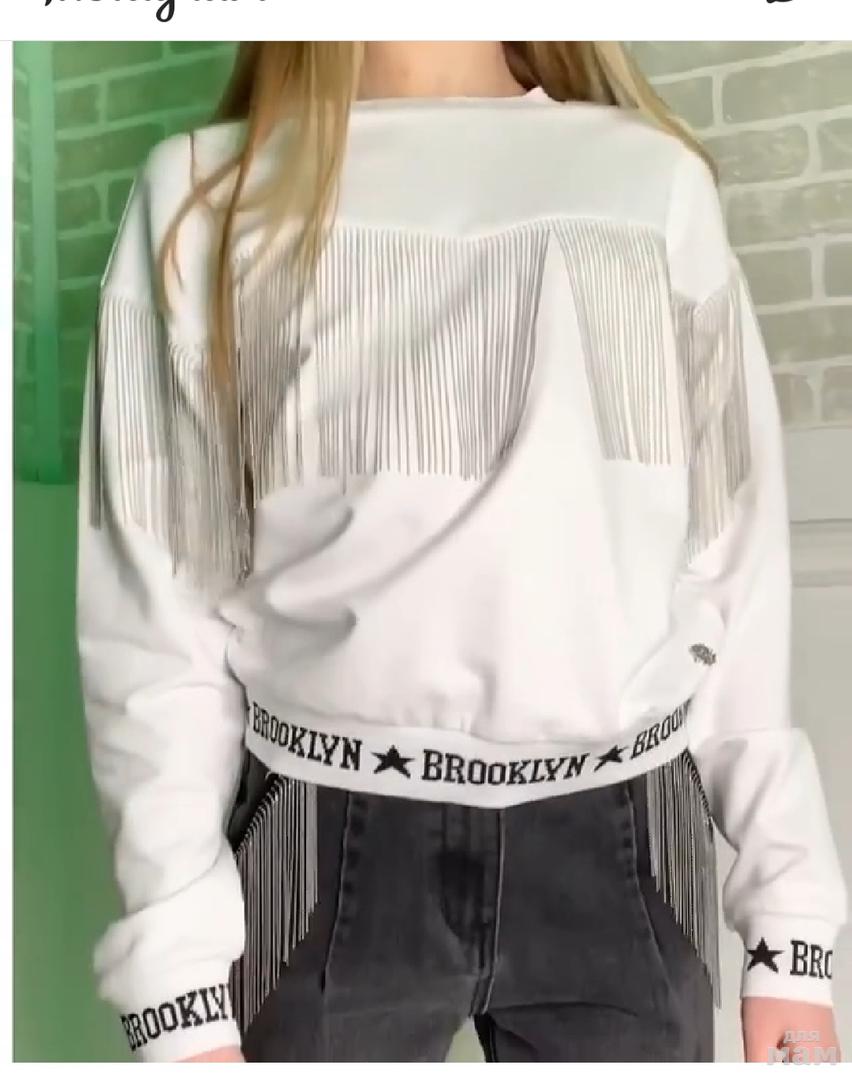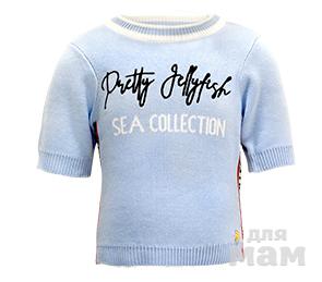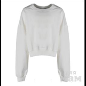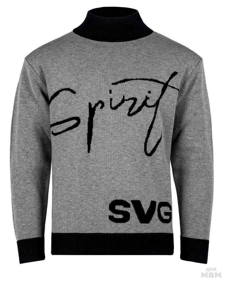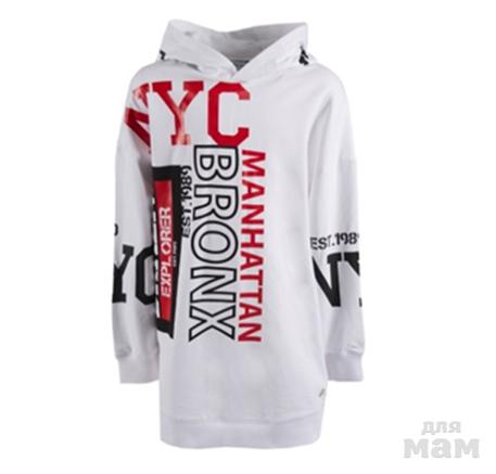 Удлиненный джемпер с треугольным вырезом и длинным рукавом. Горловина, манжеты и нижний край изделия выполнены в виде резинки из материала того же качества. На лицевой части изделия снизу крупная надпись.