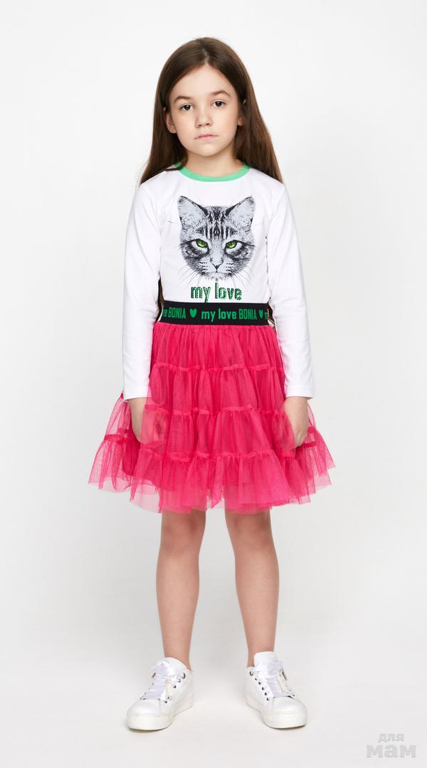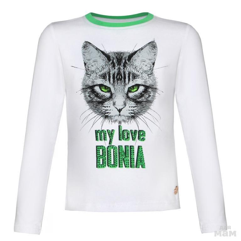 Хлопковая футболка с длинным рукавом и плотным принтом в вде кошки. Горловина выполнена из ткани того же качества зеленого цвета.