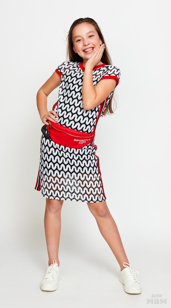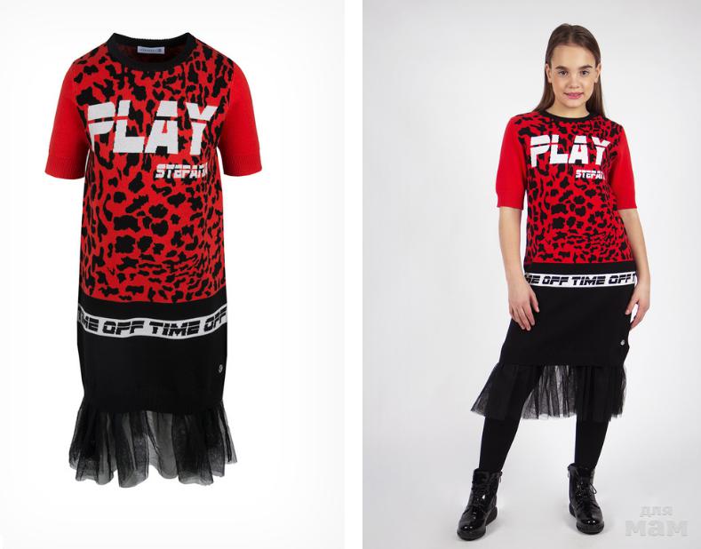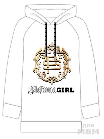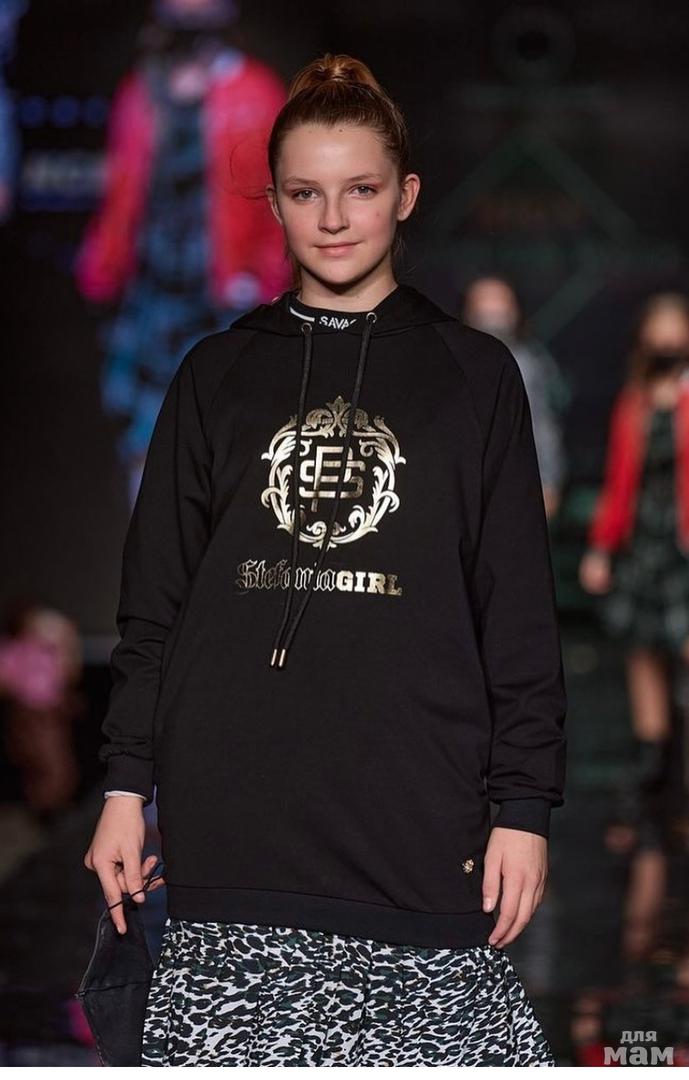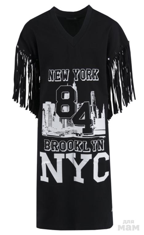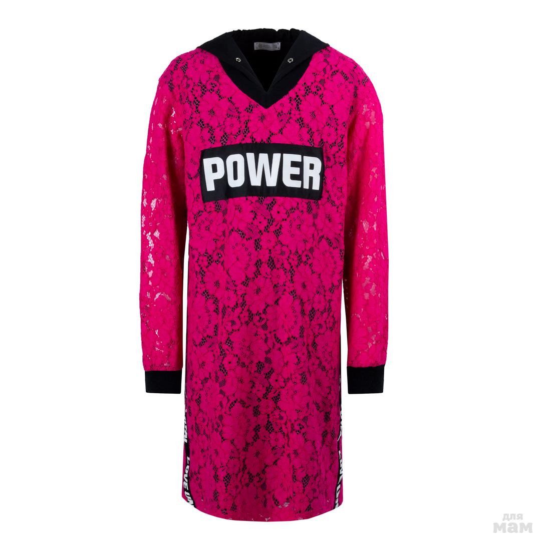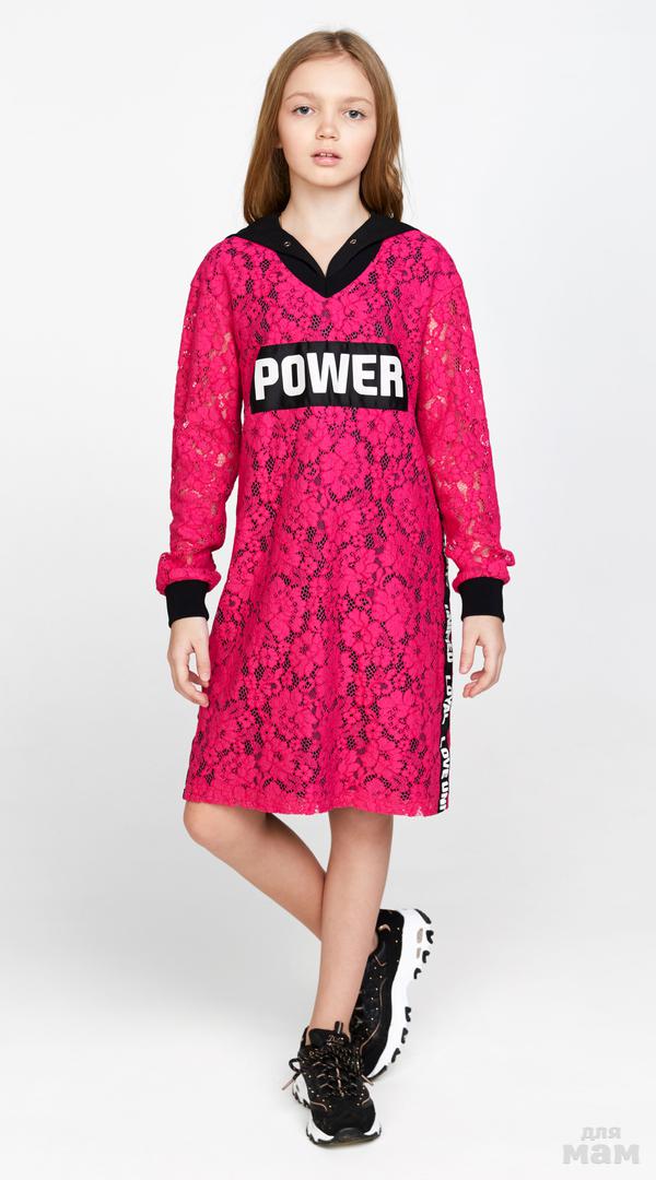 Свободное платье в спортивном стиле, из кордового гипюра на контрастной подкладке, с длинными рукавами и капюшоном из чёрного крепа. На переде крупная контрастная нашивка из широкого репса с надписью. Горловина и манжеты из чёрной рибаны. Боковые швы отделаны лампасами из контрастной тесьмы с надписями.