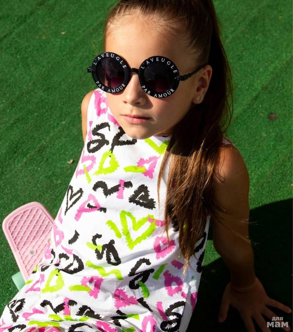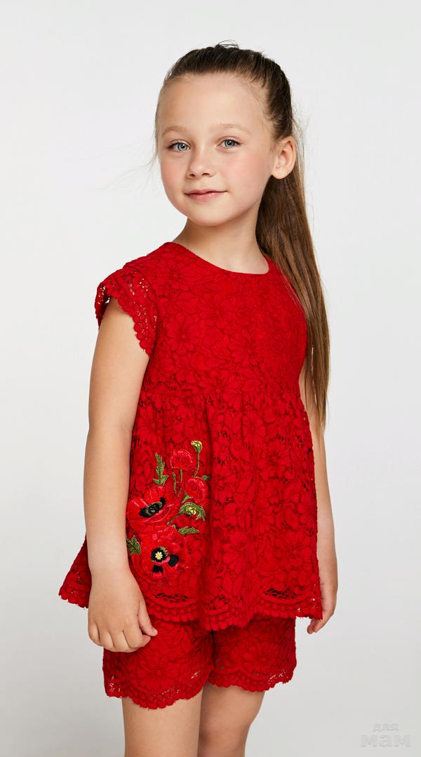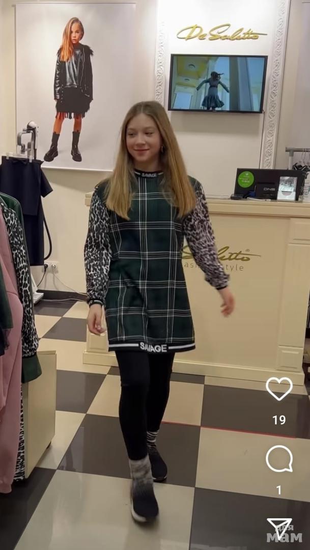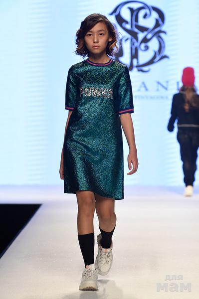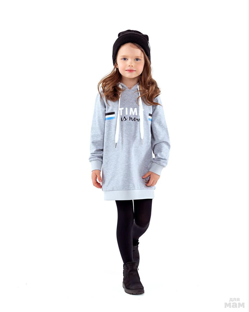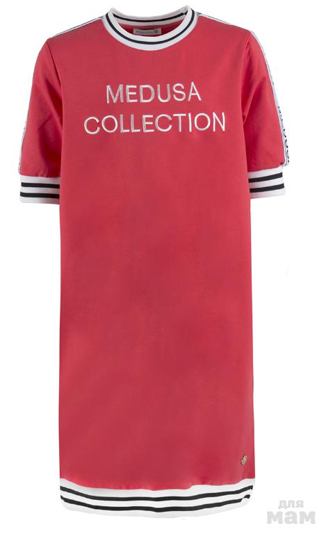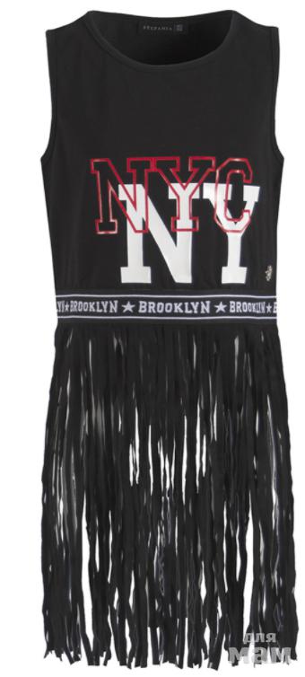 Свободное платье в спортивном стиле, из кордового гипюра на контрастной подкладке, с длинными рукавами и капюшоном из чёрного крепа. На переде крупная контрастная нашивка из широкого репса с надписью. Горловина и манжеты из чёрной рибаны. Боковые швы отделаны лампасами из контрастной тесьмы с надписями.