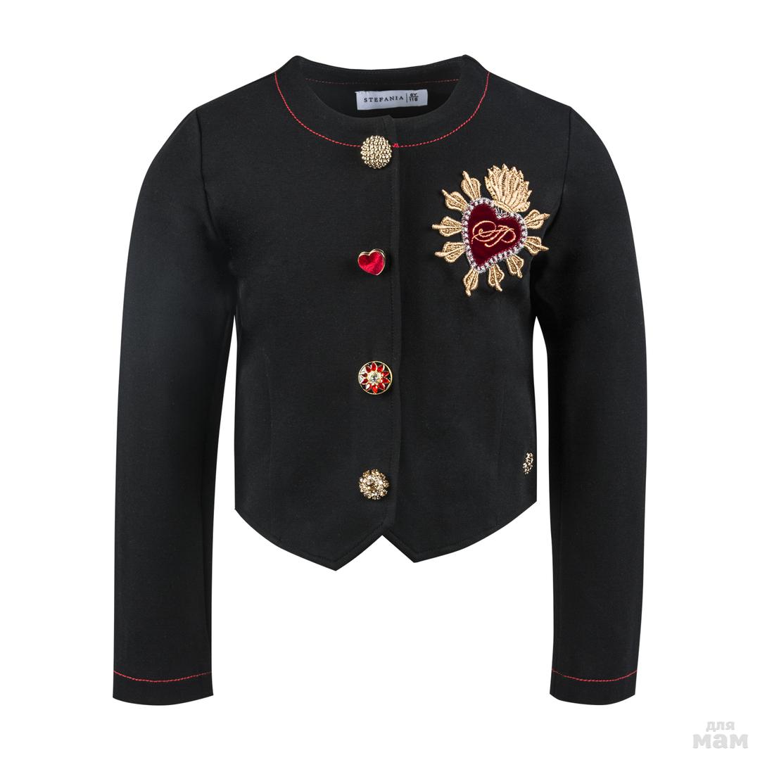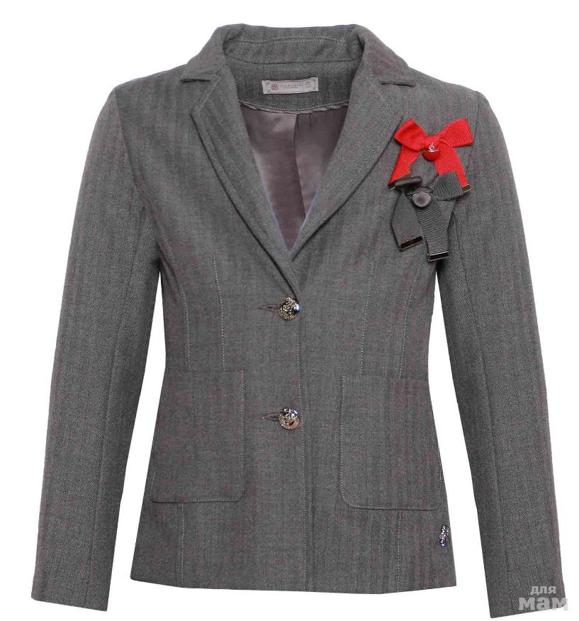 Приталенный жакет из костюмной ткани с нашивными карманами, отложным воротником с лацканами и двумя бантами из нейлоновой ленты, украшенными пуговицами в цвет.