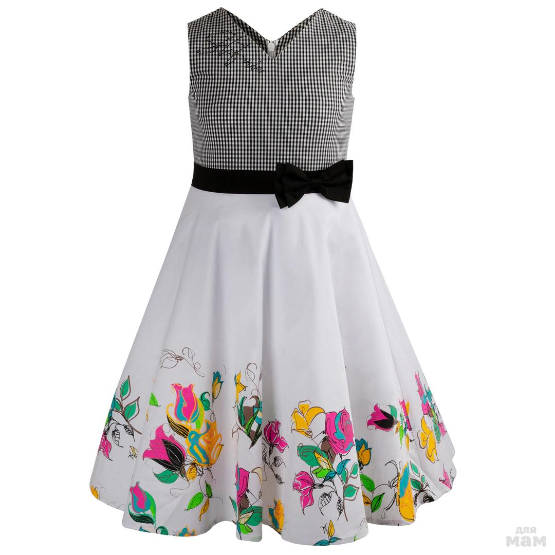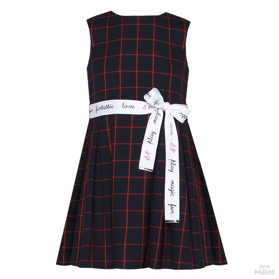 Платье из костюмной ткани с клетчатым орнаментом. С круглым вырезом и без рукава, с хлопковой подкладкой. На линии талии белая лента, которая завязывается в бант. Сзади застегивается на потайную молнию.