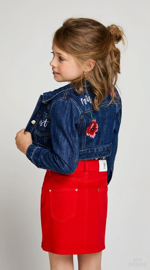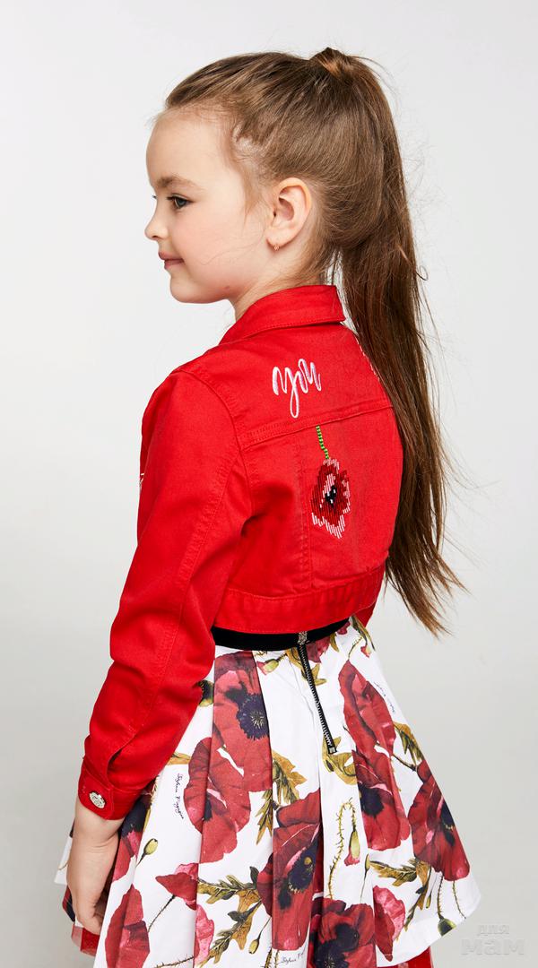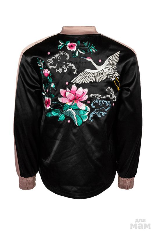 Утеплённый двухцветный бомбер из курточного сатина, на молнии, с воротником-стойкой и эластичными манжетами. На спине крупная аппликация из вышивки.