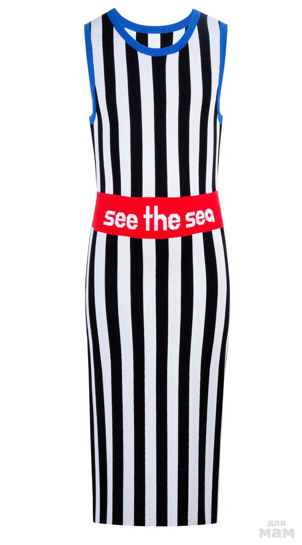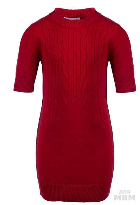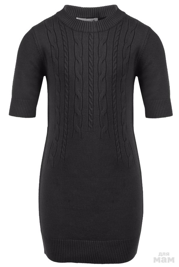 Вязаное платье-пуловер, с длинными рукавами и декоративными боковыми застёжками из контрастной тесьмы с надписями и металлических колец. Проймы украшены контрастными вязаными оборками, на переде вывязанная жаккардом надпись. V-образная горловина связана резинкой в контрастную полоску, низ рукавов и изделия - резинкой в тон.