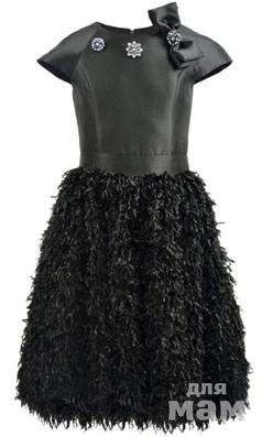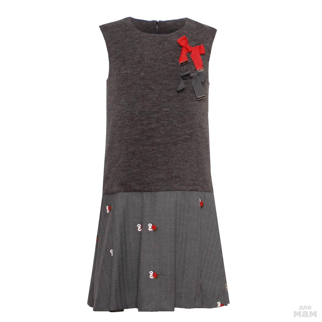 Платье-трапеция со спущенной линией талии из комбинировнных тканей. Верх - шерсть, мелкая вязка+подкладка, низ - костюмная ткань, плиссированная юбка. Лицевая сторона изделия декорирована двумя бантиками из нейлоновой ленты. На юбке орнамент из вышивки в виде аккуратных небольших цветов. В качестве застёжки - потайная молния на спинке.