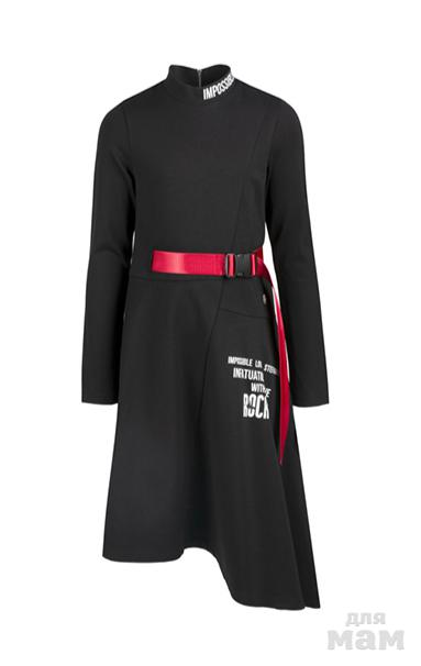 Комбинированное платье из костюмной ткани с круглым вырезом и длинным ирукавом. На лицевой стороне изделия вышита надпись, также платье декорировано бантом из ткани того жэе качества. Сзади застегивается на потайную молнию. Манжеты выполнены из резинки синего цвета