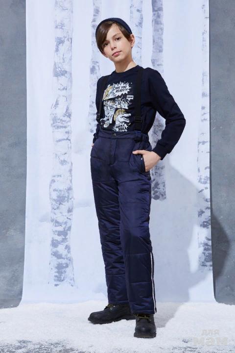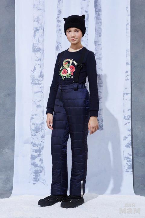 Брюки, слегка зауженные к низу с притачным поясом на резинке и прорезными карманами на молнии. Используется функциональный синтетический наполнитель, который позволяет обеспечить не только тепло, но и лёгкость в уходе при многочисленных стирках: хорошо переносит стирку, не комкуется, быстро сохнет. Брюки выполнены из современной ткани для верхней одежды с эффектом перелива, который достигается благодаря окрашиванию нитей в контрастные цвета перед производством ткани, ткань обладает ветро- и влагозащитными функциями. Брюки дополнены съемными, регулируемыми эластичными бретелями, которые надёжно финсируются на кнопке и липучке, а также функциональными карманами на кнопке в боковых швах. Внизу штанина декорирована светоотражающим кантом, чтобы обеспечивать должную безопасность ребёнка на дороге.