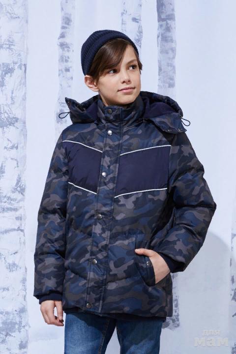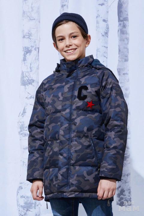 Зимняя куртка из структурированной ткани с милитари принтом и контрастными вставками динамичной формы, по краю вставки проходит светоотражающий кант. Используется инновационный утеплитель - искусственный пух SUSTANS® от DuPont™, 280 г/м2, легкий и обладающий более высокой теплоёмкостью. Несмотря на кажущуюся лёгкость, изделие без проблем выдерживает морозы до -20 градусов (с термобельём до -30). Куртка дополнена воротником-стойкой и длинными втачными рукавами с вязаными трикотажными манжетами внутри, а также съемным капюшоном с пристяжной меховой опушкой и накладными карманами с клапанами и застежкой на кнопку. Комбинированная подкладка, сочетает тепло и комфорт флиса вверху, а нижняя часть из гладкой таффеты прекрасно подходит для ношения с любыми брюками. Декорирована светоотражающим патчем в нижней части спинки.