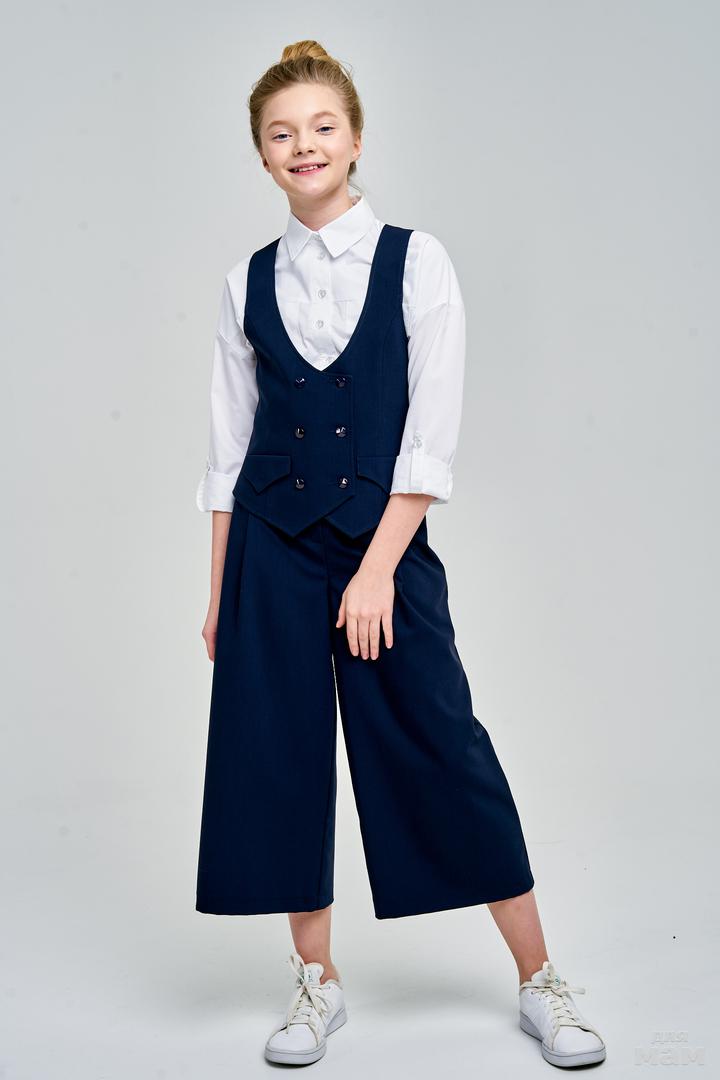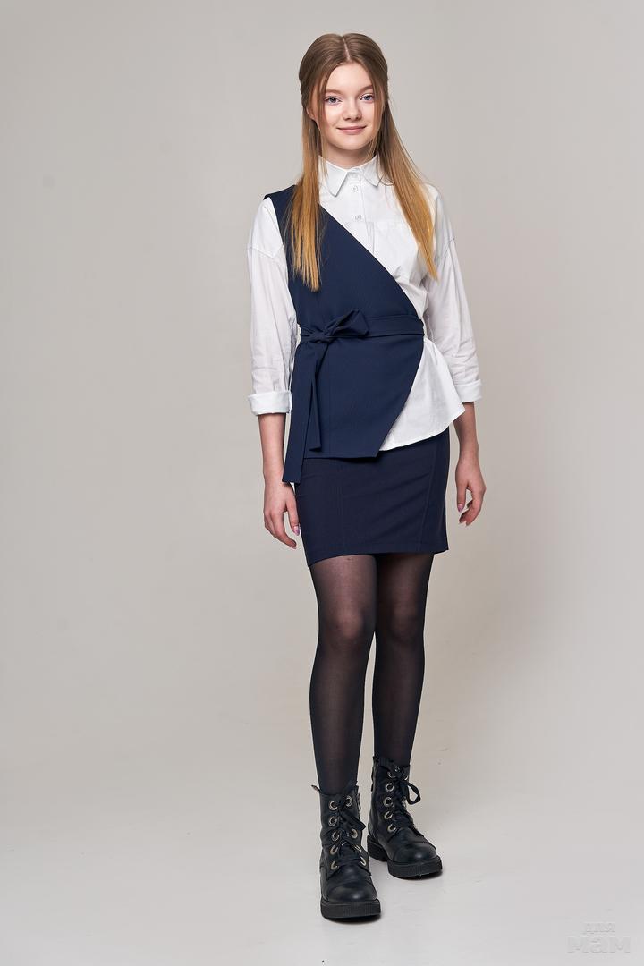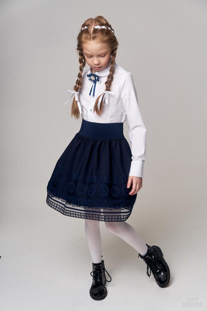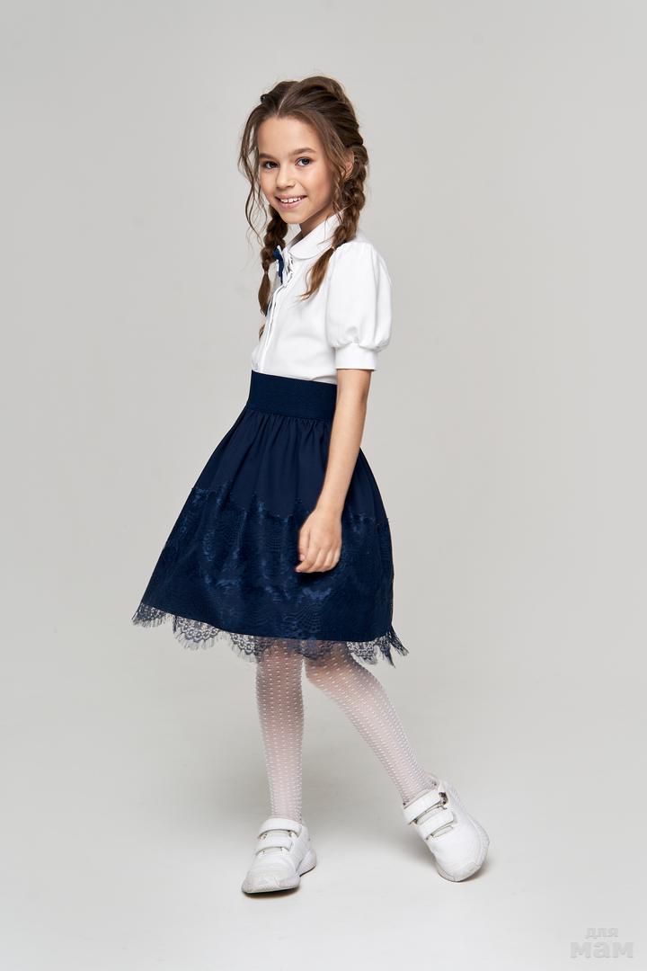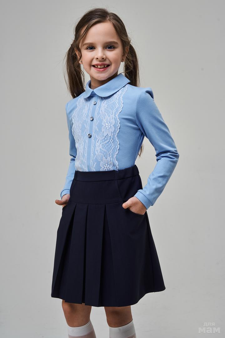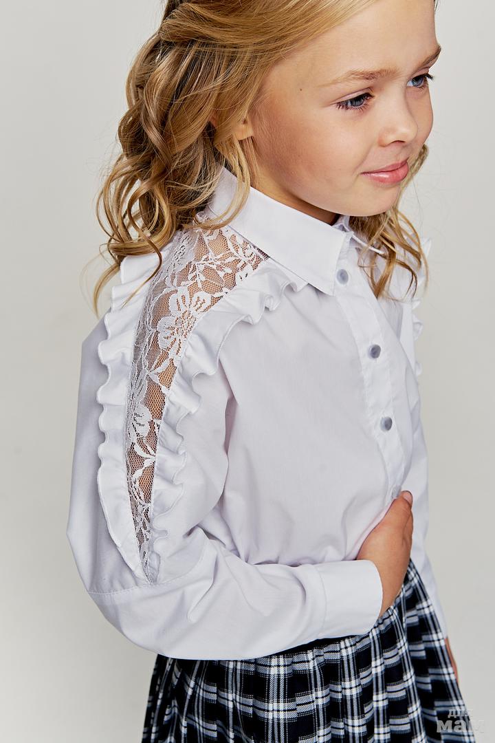 Удобная и нарядная блузка под любую жилетку или сарафан. Выполнена из качественного трикотажа и украшена благородным кружевом. Отложной воротничок на стойке подойдет для школьного галстука.